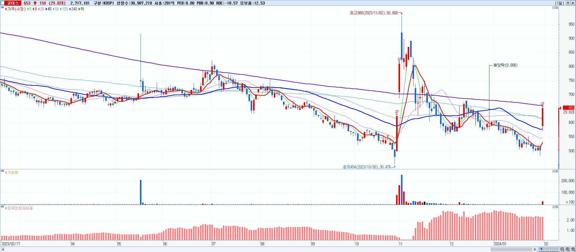 - 코아스 (653원 ▲ 29.82% , 시총: 202억, 거래량: 2,718,101, 거래대금:17억)