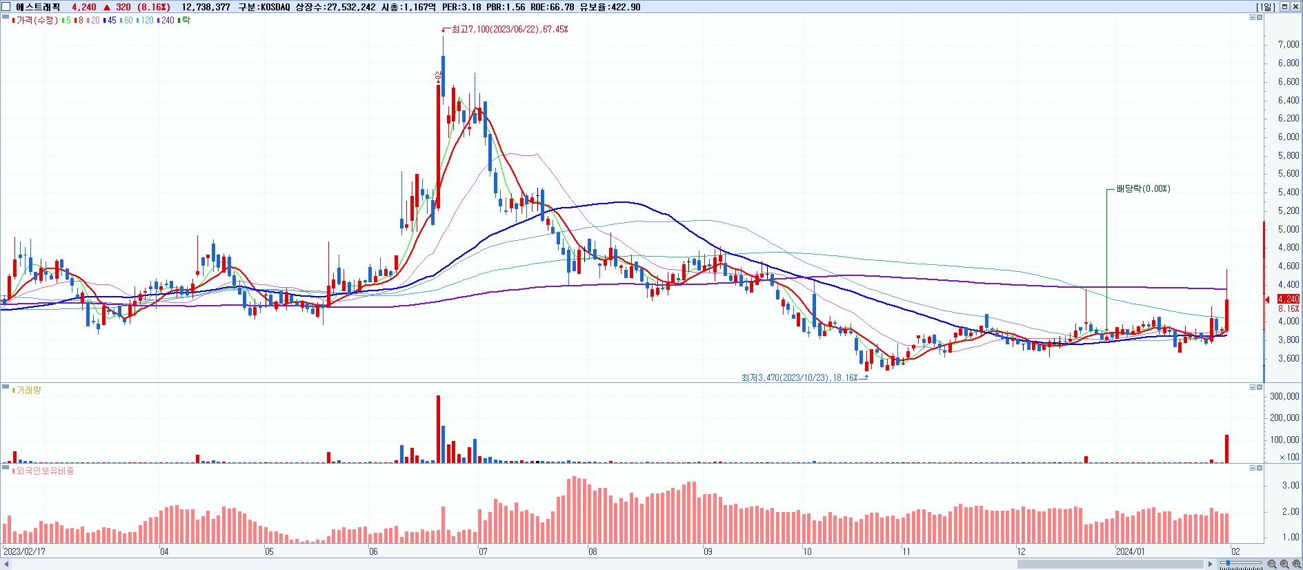 - 에스트래픽 (4,240원 ▲ 8.16% , 시총: 1,167억, 거래량: 12,761,867, 거래대금:555억)