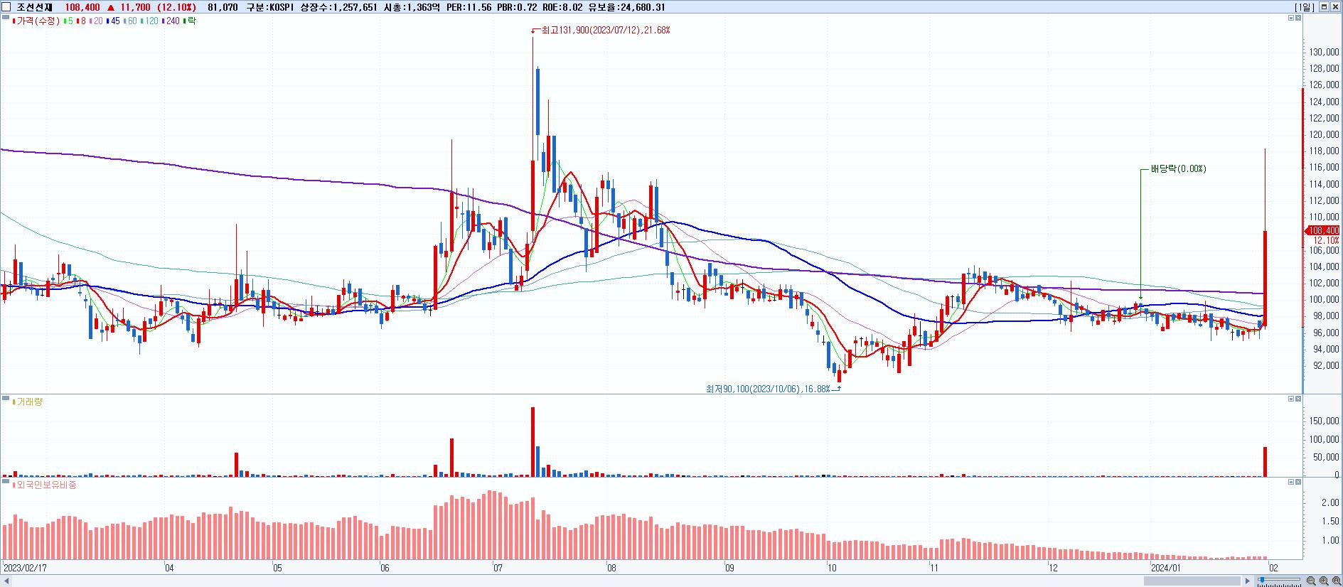 - 조선선재 (108,400원 ▲ 12.1% , 시총: 1,363억, 거래량: 82,689, 거래대금:89억)