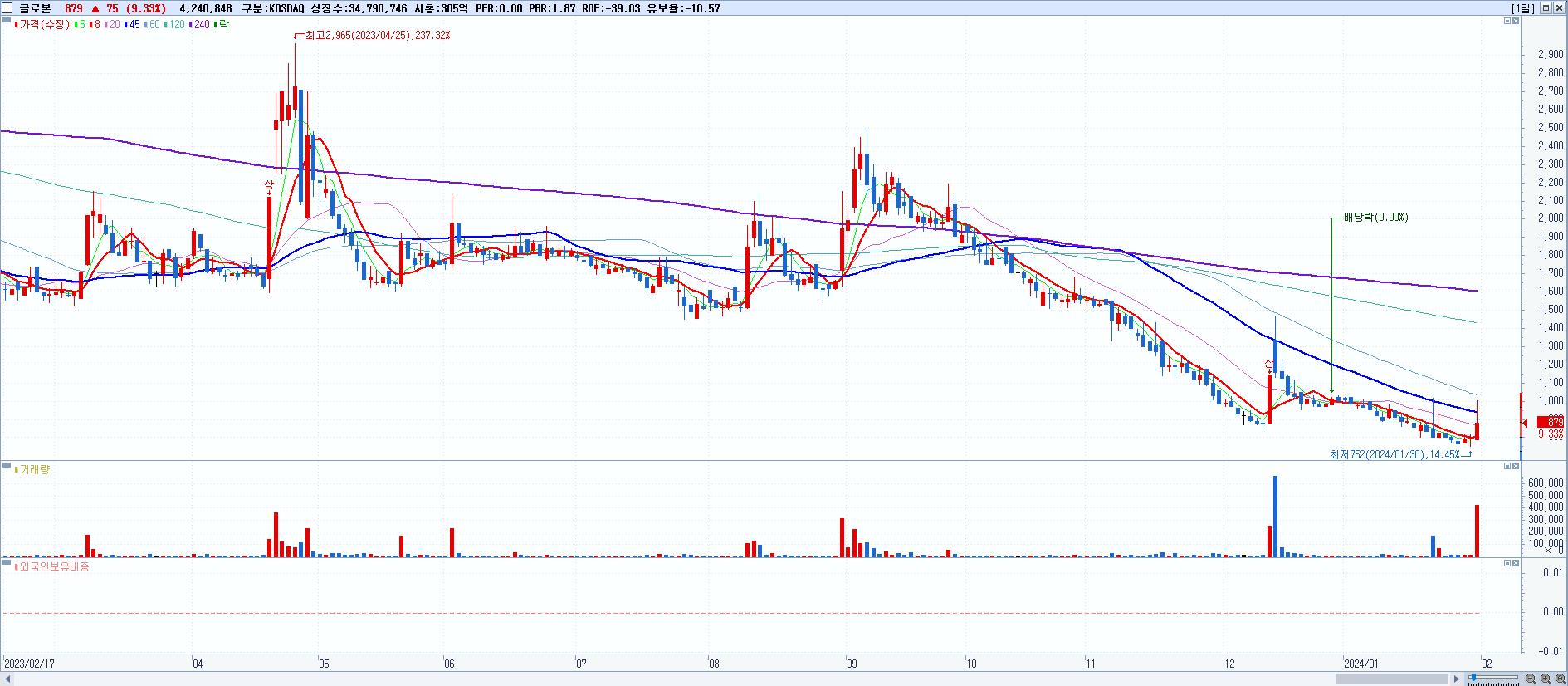- 글로본 (879원 ▲ 9.33% , 시총: 306억, 거래량: 4,244,537, 거래대금:39억)