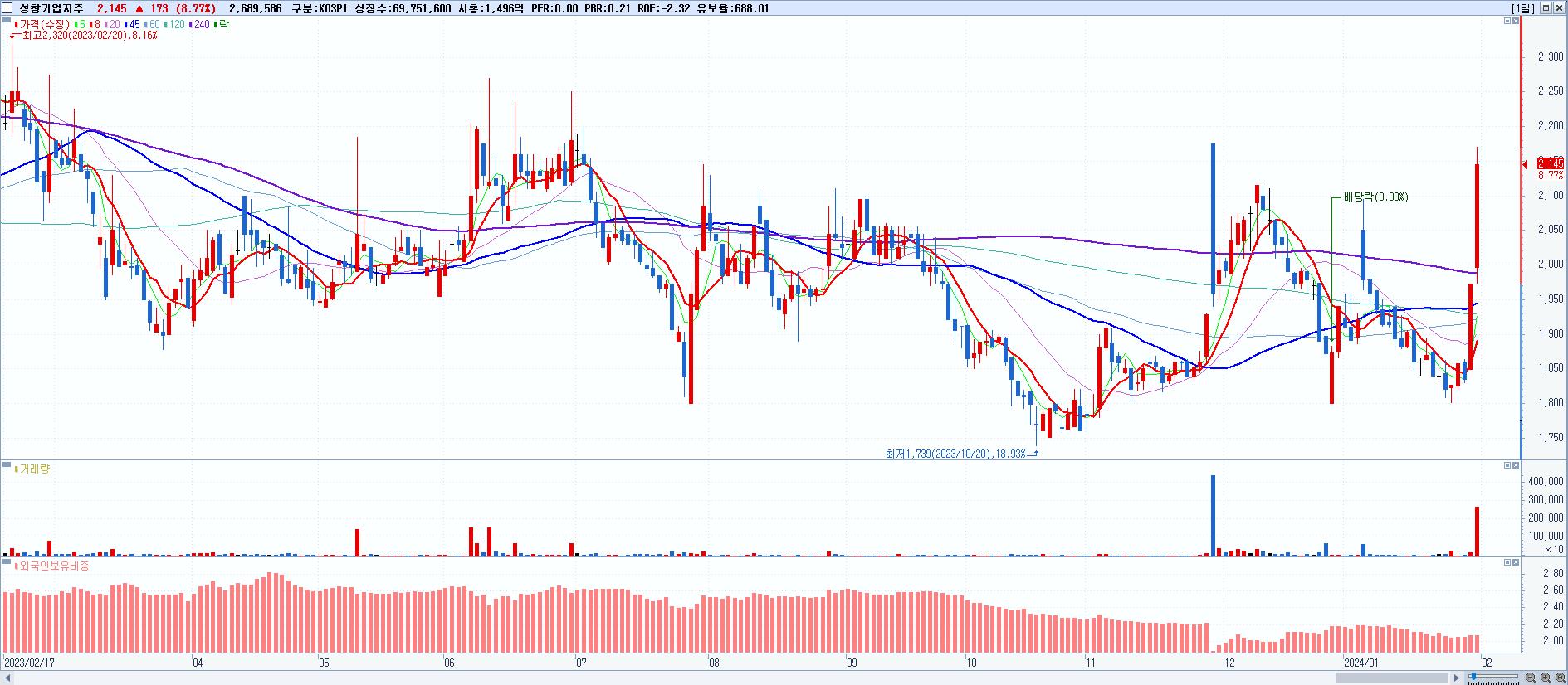 - 성창기업지주 (2,145원 ▲ 8.77% , 시총: 1,496억, 거래량: 2,694,486, 거래대금:56억)