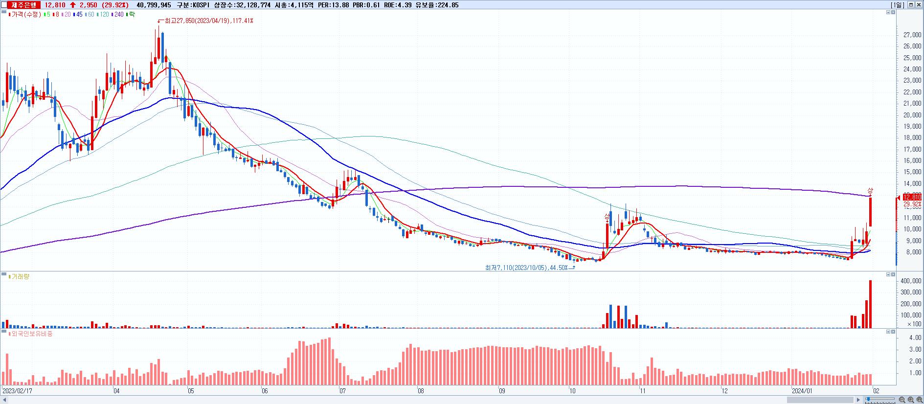 - 제주은행 (12,810원 ▲ 29.92% , 시총: 4,116억, 거래량: 40,811,307, 거래대금:4,738억)