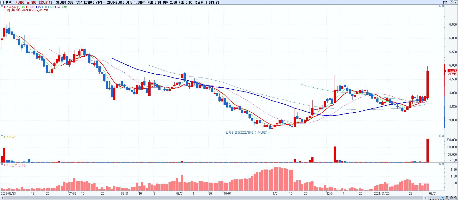 - 팸텍 (4,805원 ▲ 23.21% , 시총: 1,386억, 거래량: 31,996,762, 거래대금:1,503억)