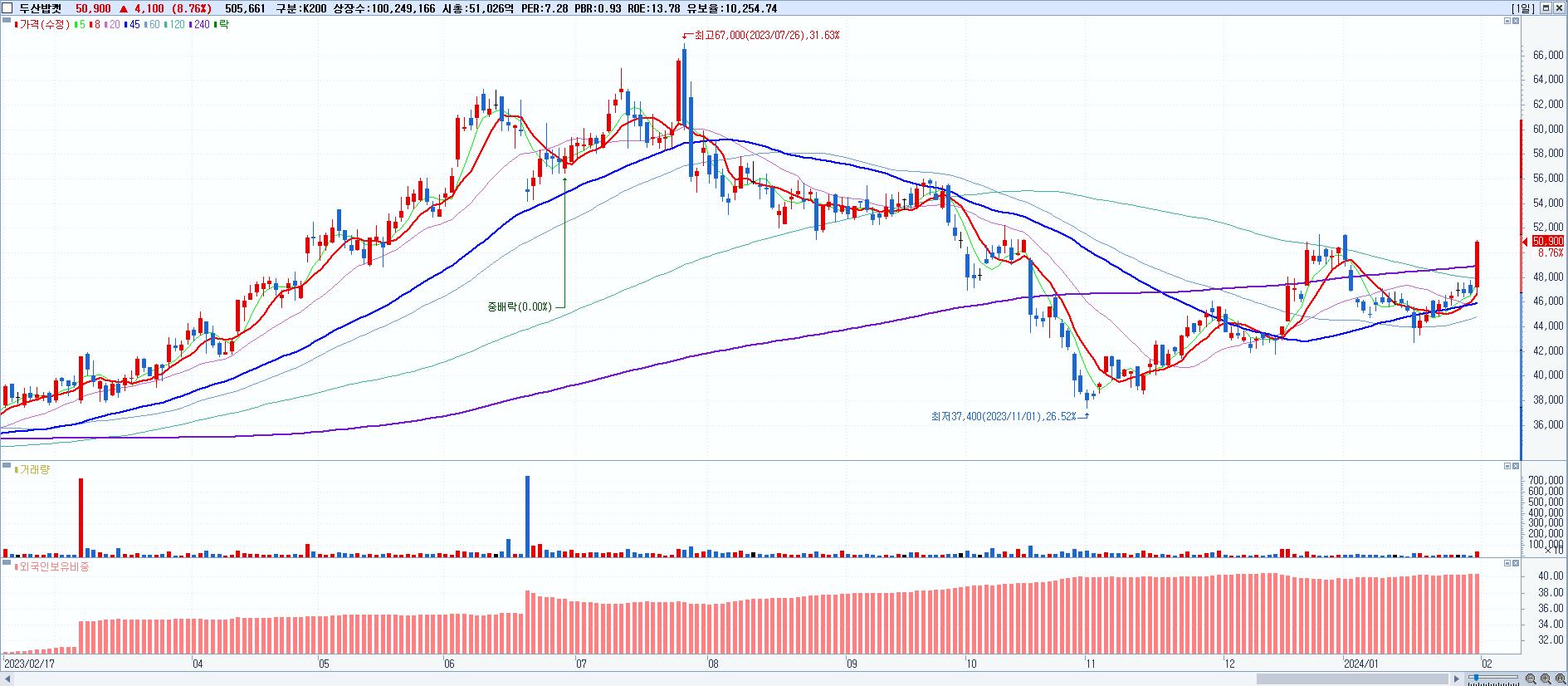 - 두산밥캣 (50,900원 ▲ 8.76% , 시총: 51,027억, 거래량: 545,330, 거래대금:272억)