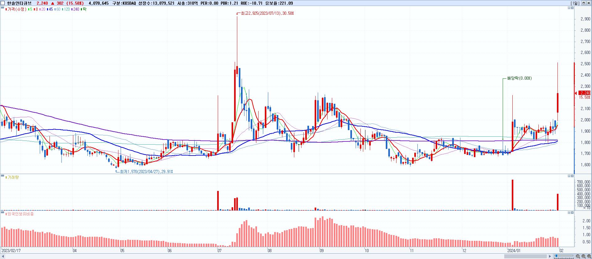 - 한솔인티큐브 (2,240원 ▲ 15.58% , 시총: 311억, 거래량: 4,377,515, 거래대금:104억)