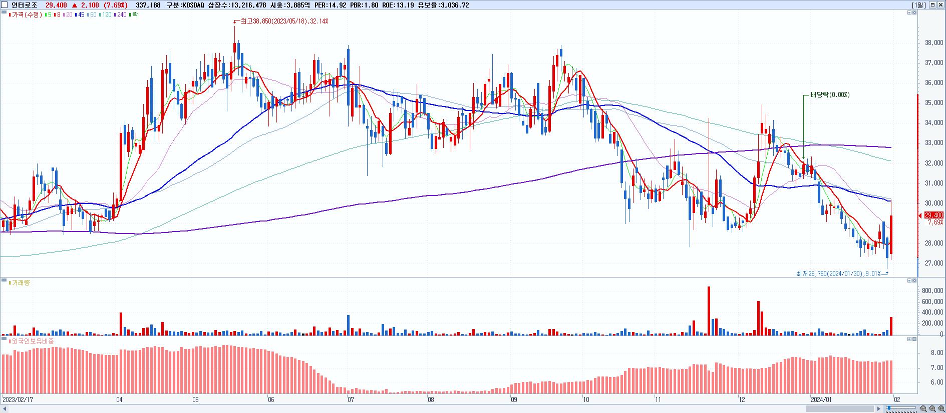 - 인터로조 (29,400원 ▲ 7.69% , 시총: 3,886억, 거래량: 337,398, 거래대금:99억)