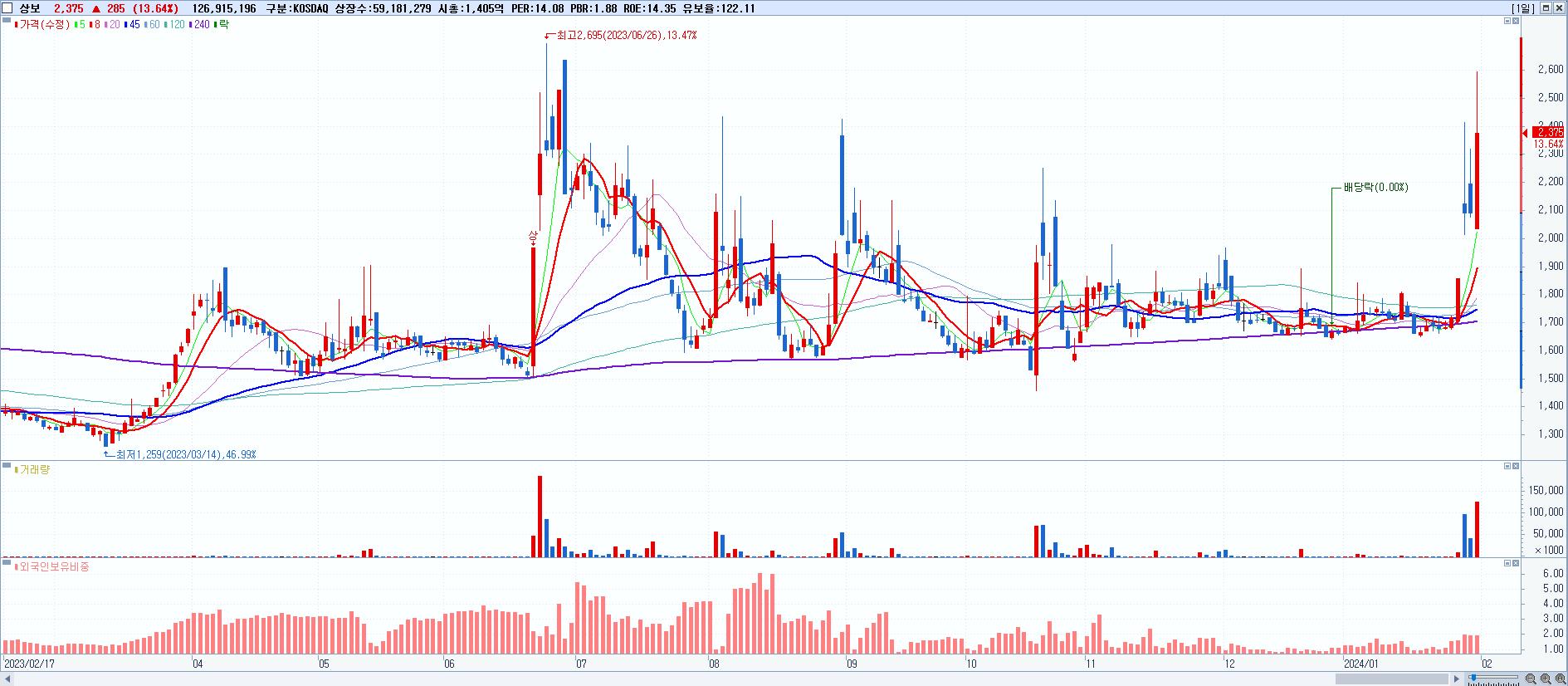 - 상보 (2,375원 ▲ 13.64% , 시총: 1,406억, 거래량: 127,833,496, 거래대금:3,043억)