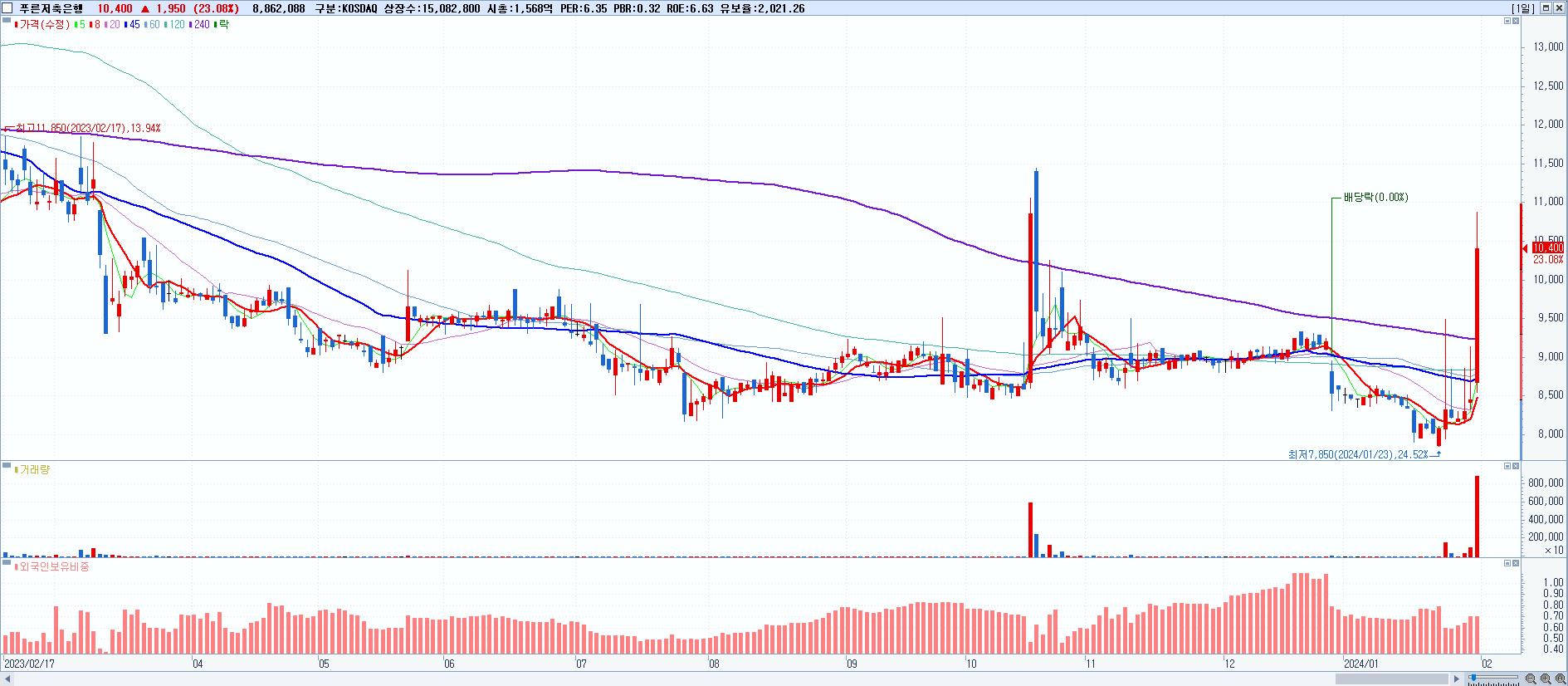 - 푸른저축은행 (10,400원 ▲ 23.08% , 시총: 1,569억, 거래량: 9,007,811, 거래대금:896억)