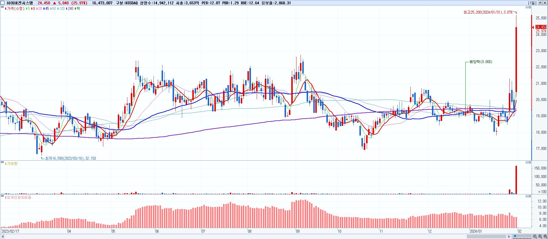 - 하이비젼시스템 (24,450원 ▲ 25.97% , 시총: 3,653억, 거래량: 16,549,272, 거래대금:3,949억)