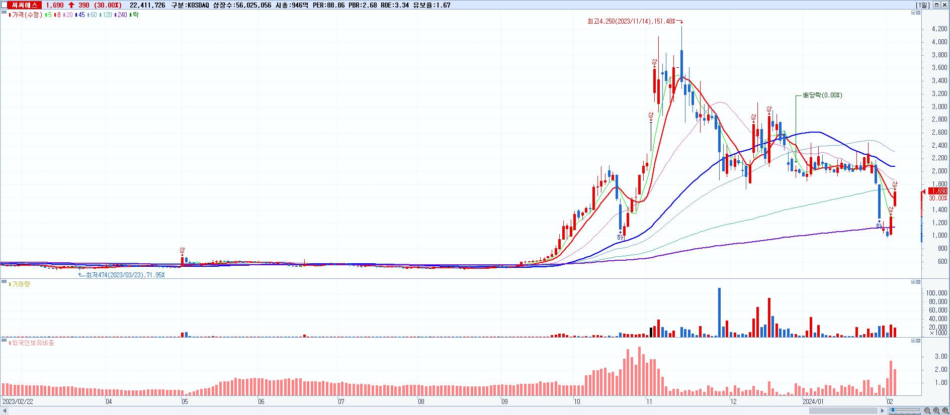 시총: 2,564억 거래량: 4,063,141 거래대금:1,189억