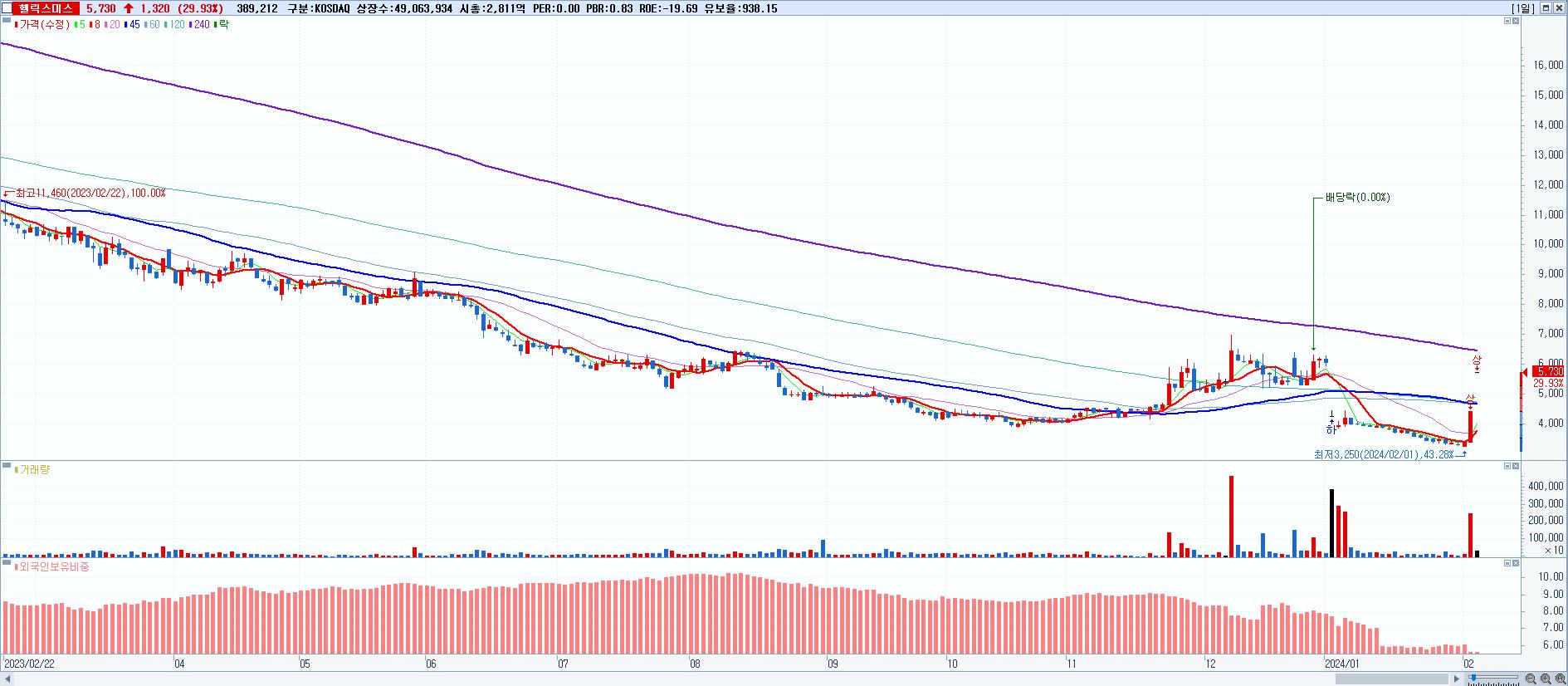 시총: 2,811억 거래량: 389,212 거래대금:22억