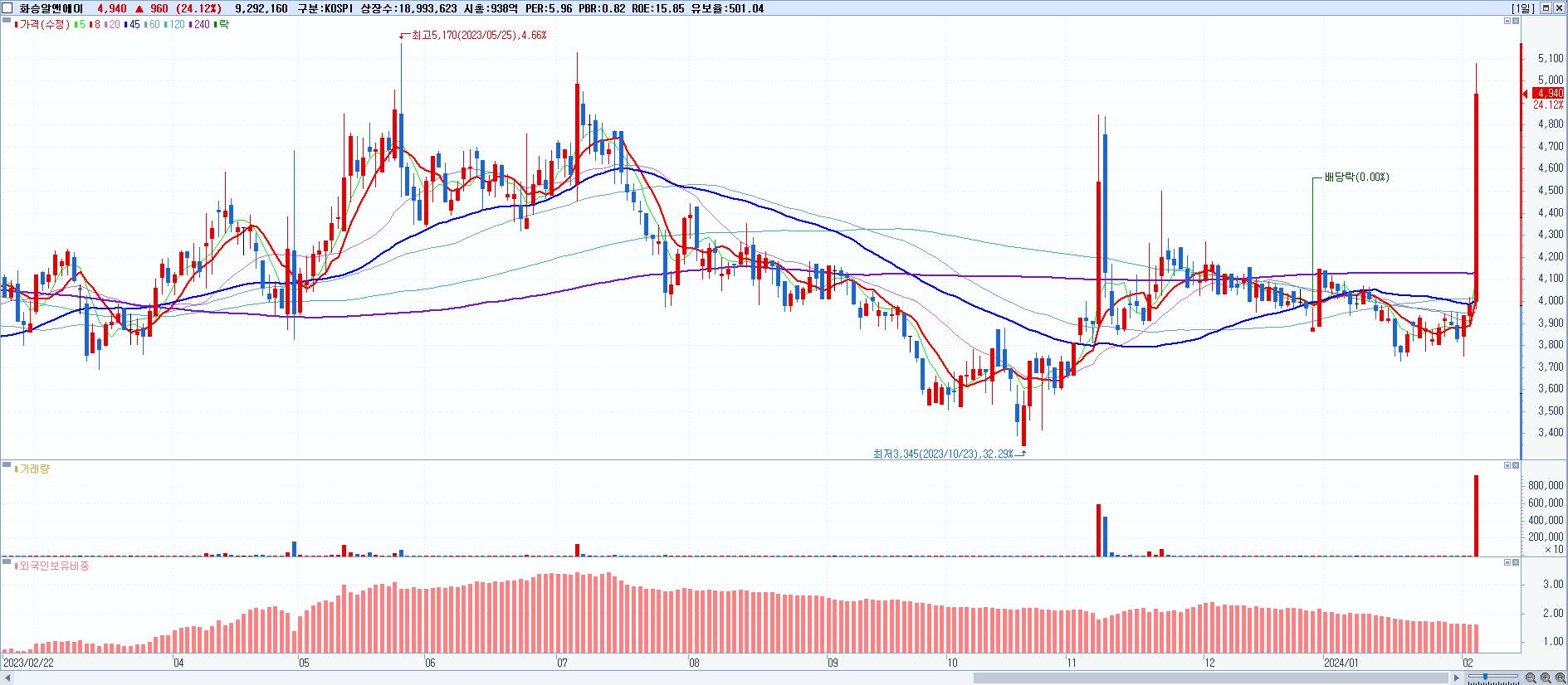 - 화승알앤에이 (4,940원 ▲ 24.12% , 시총: 938억, 거래량: 9,311,874, 거래대금:447억)