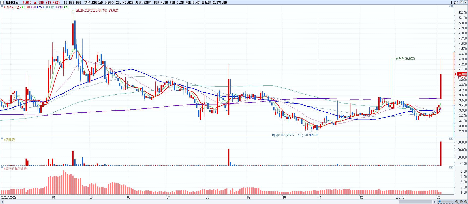 - 모베이스 (4,010원 ▲ 17.42% , 시총: 928억, 거래량: 15,613,299, 거래대금:640억)