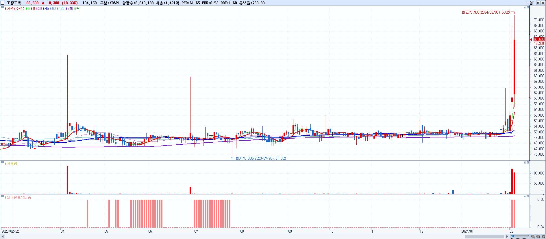 - 조광피혁 (66,500원 ▲ 18.33% , 시총: 4,422억, 거래량: 104,502, 거래대금:67억)