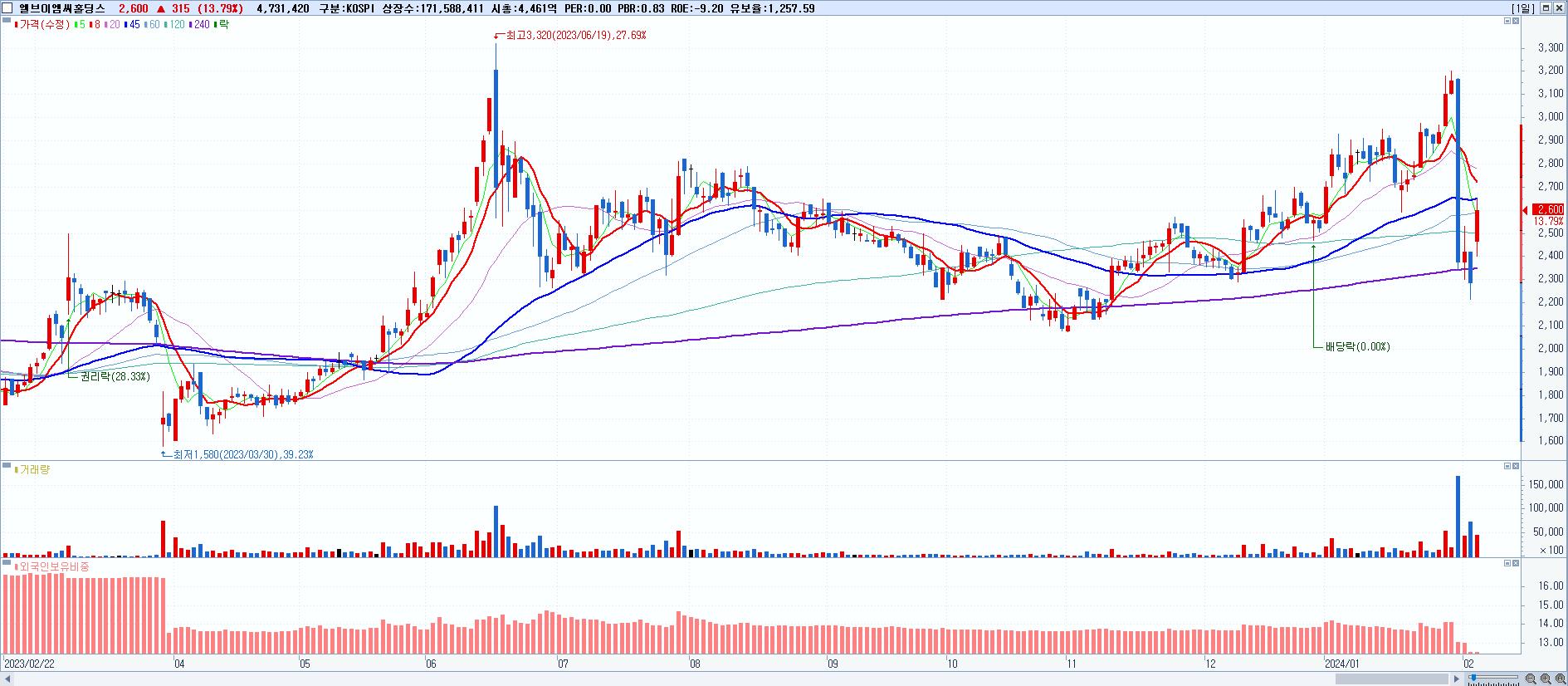 - 엘브이엠씨홀딩스 (2,600원 ▲ 13.79% , 시총: 4,461억, 거래량: 4,733,633, 거래대금:119억)