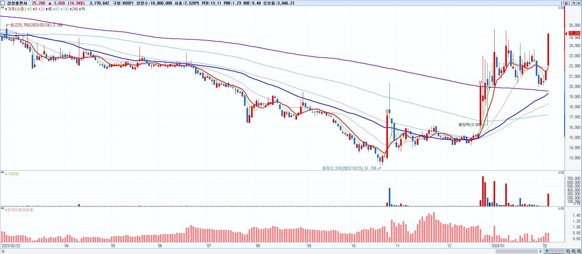 - 삼성출판사 (25,200원 ▲ 16.94% , 시총: 2,520억, 거래량: 3,189,394, 거래대금:765억)