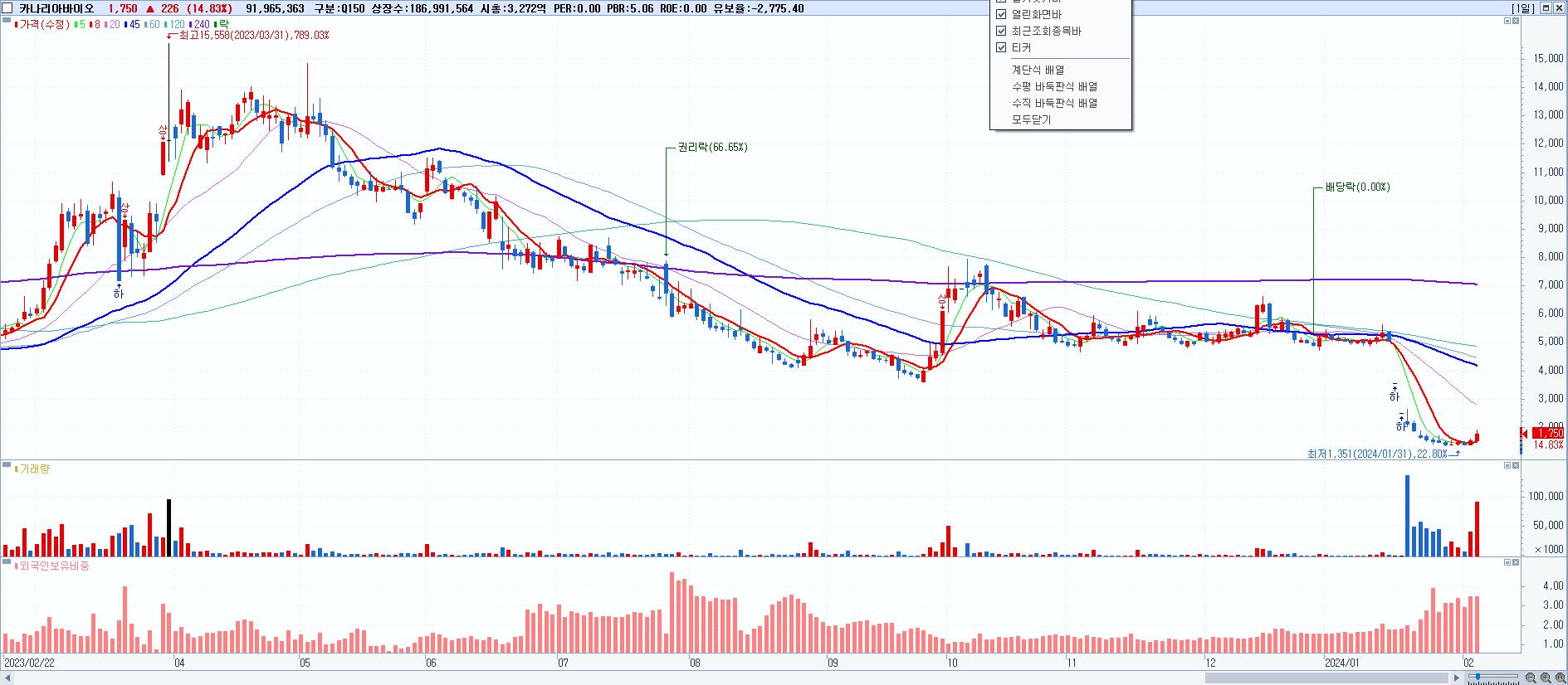 - 카나리아바이오 (1,750원 ▲ 14.83% , 시총: 3,272억, 거래량: 92,013,888, 거래대금:1,603억)