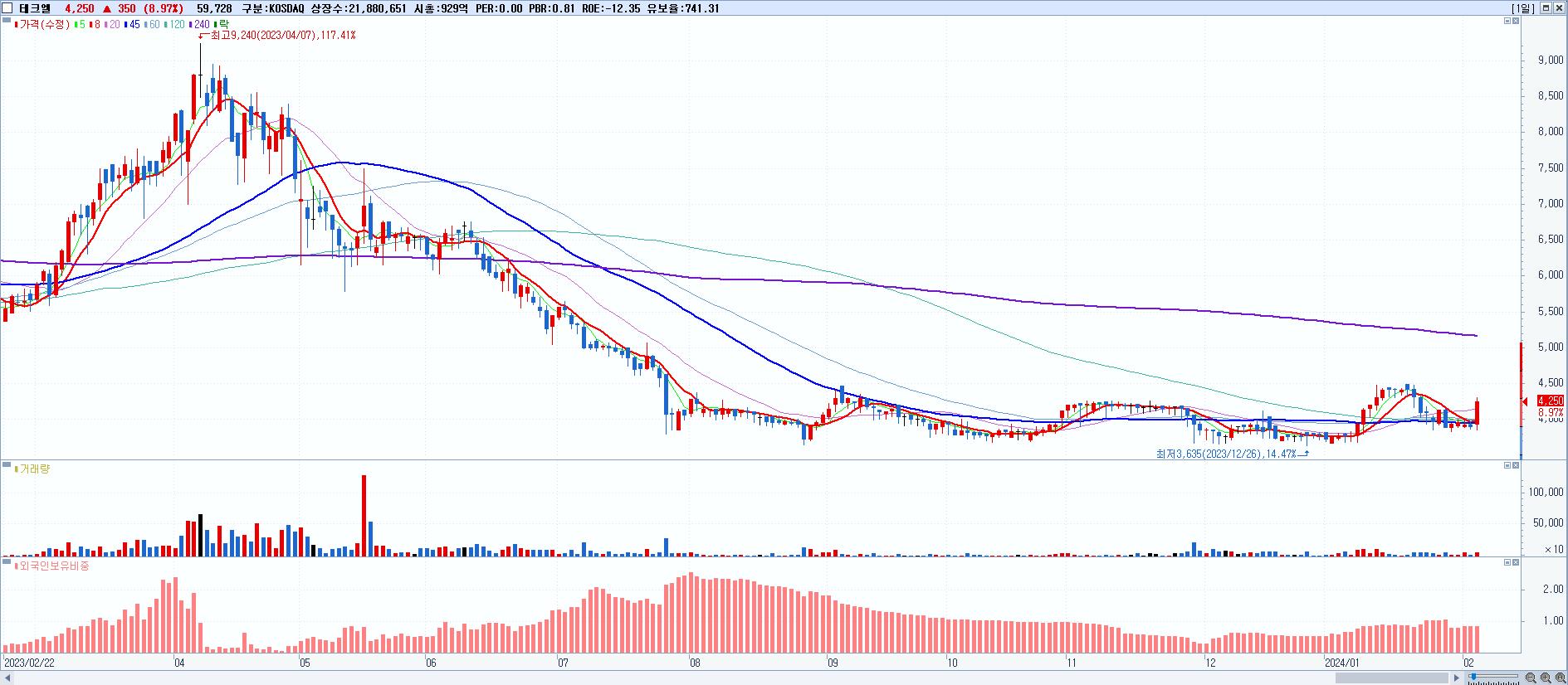 30.테크엘 4,250원 ▲ 8.97% (KOSDAQ, 064520)