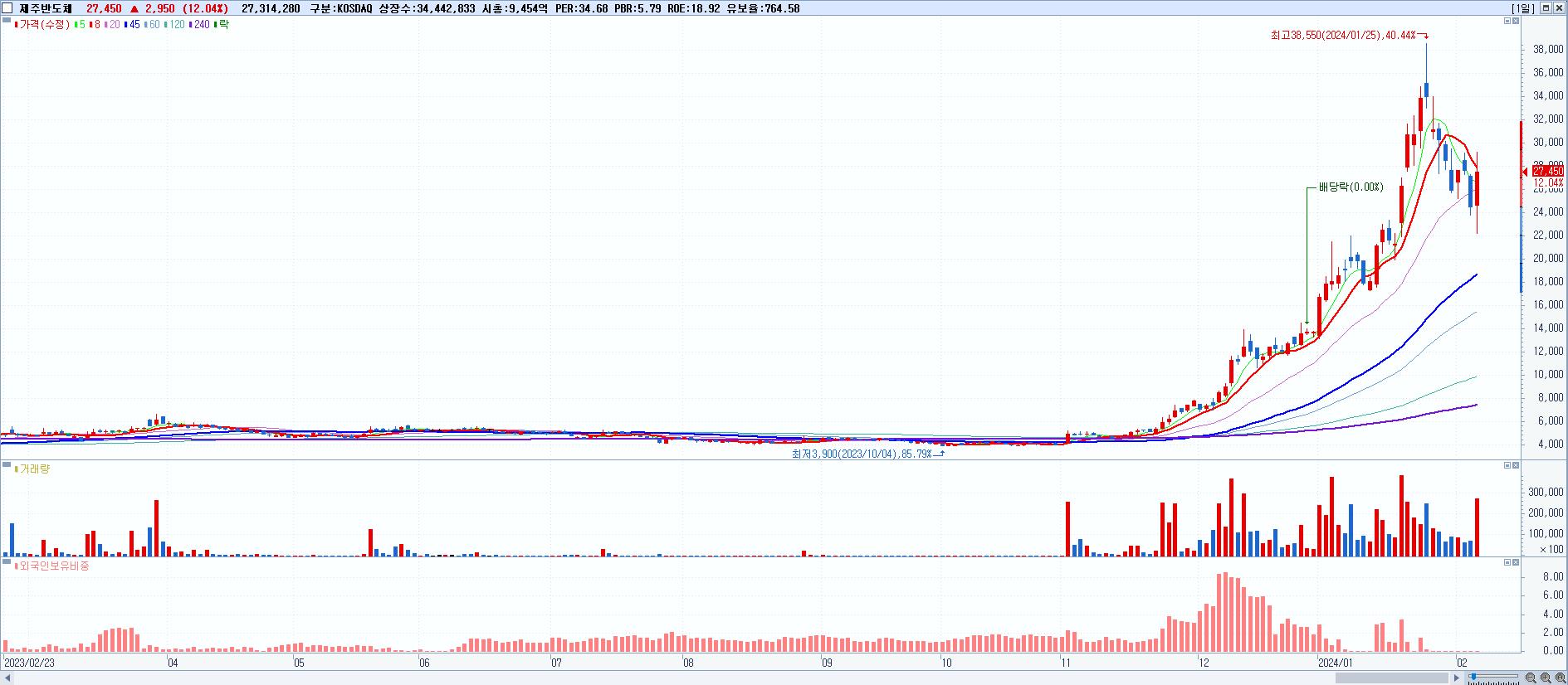 - 제주반도체 (27,450원 ▲ 12.04% , 시총: 9,455억, 거래량: 27,421,651, 거래대금:7,048억)
