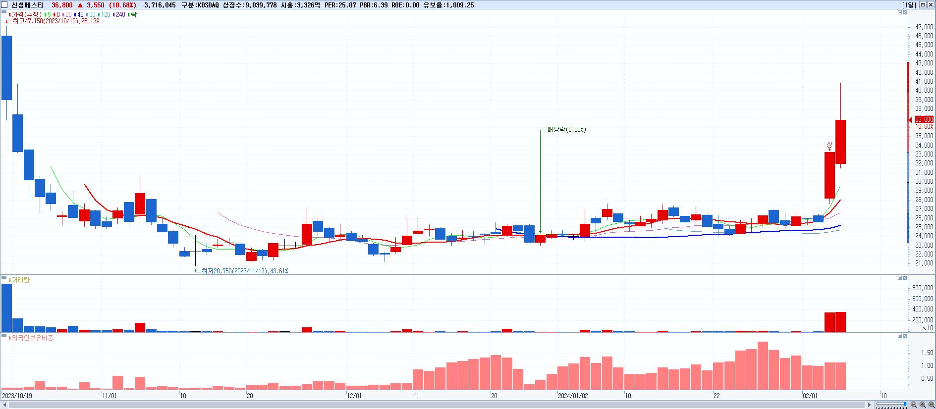 - 신성에스티 (36,800원 ▲ 10.68% , 시총: 3,327억, 거래량: 3,723,122, 거래대금:1,383억)