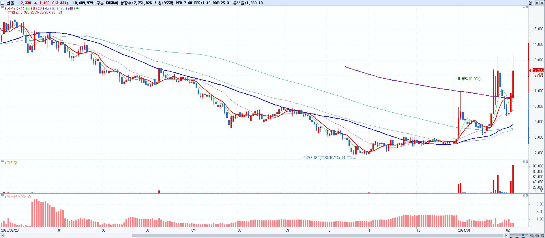 - 산돌 (12,330원 ▲ 13.43% , 시총: 956억, 거래량: 10,571,617, 거래대금:1,316억)