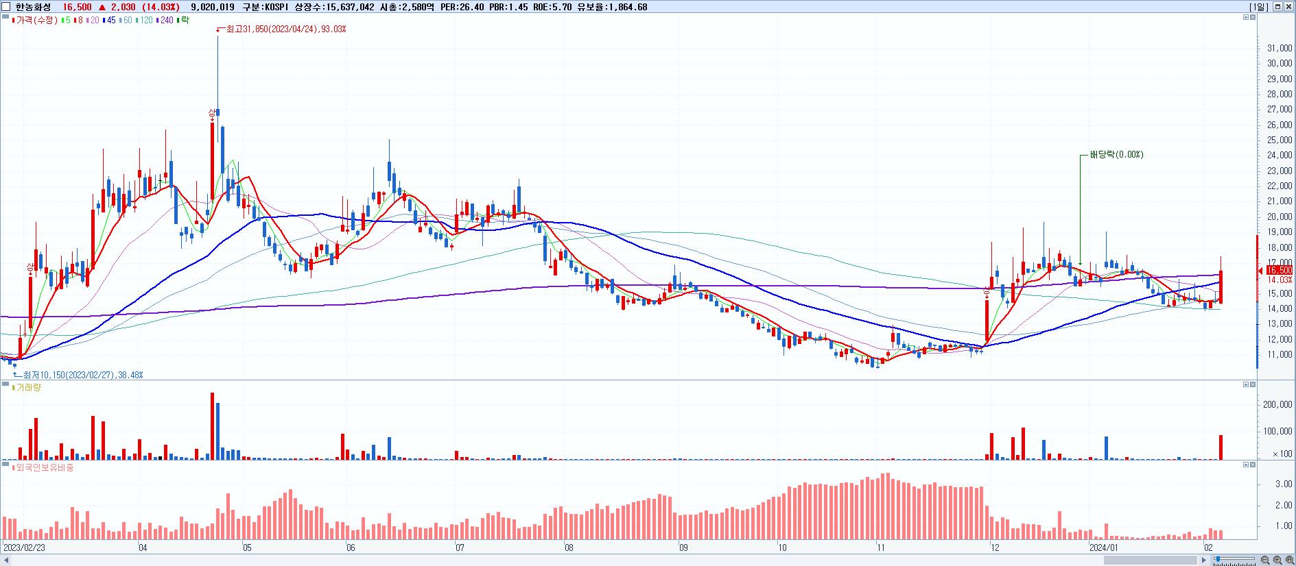 - 한농화성 (16,500원 ▲ 14.03% , 시총: 2,580억, 거래량: 9,042,483, 거래대금:1,505억)