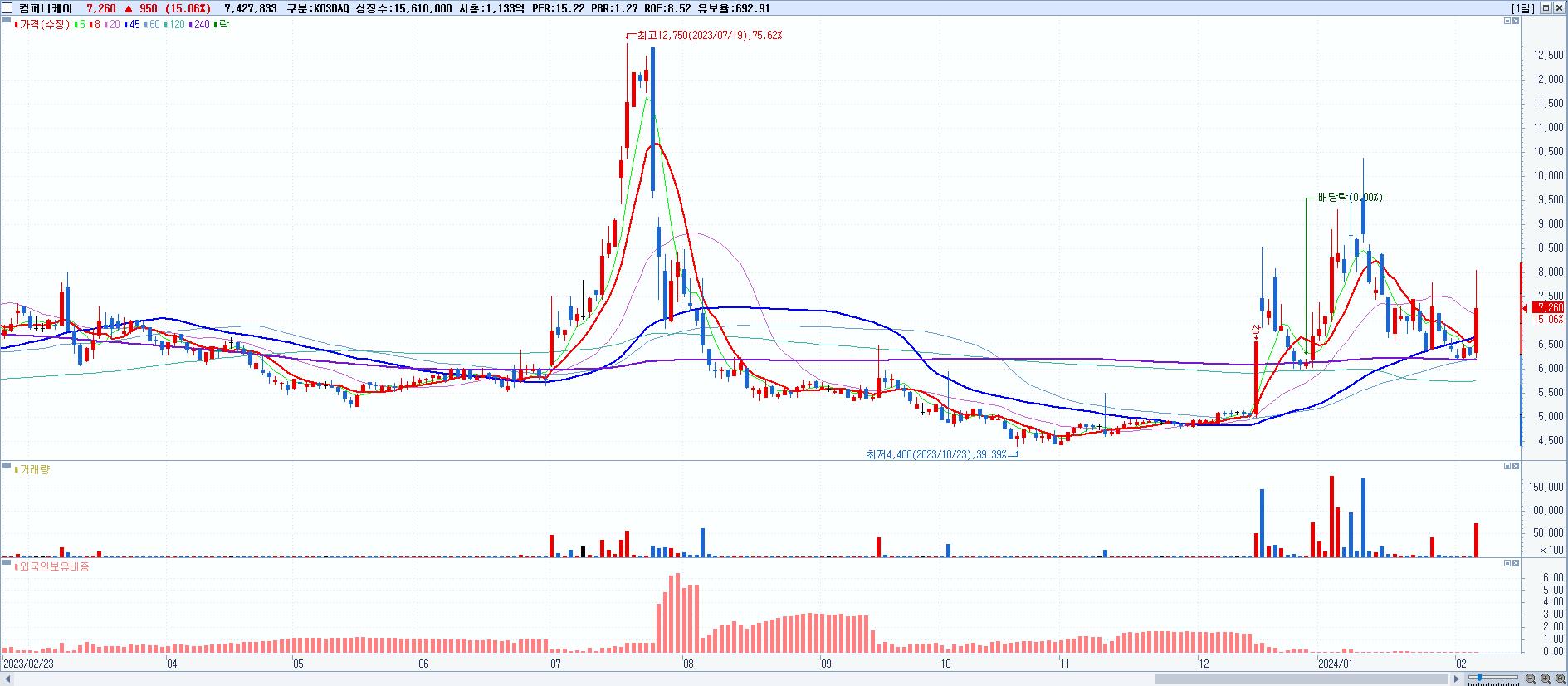 - 컴퍼니케이 (7,260원 ▲ 15.06% , 시총: 1,133억, 거래량: 7,707,995, 거래대금:566억)