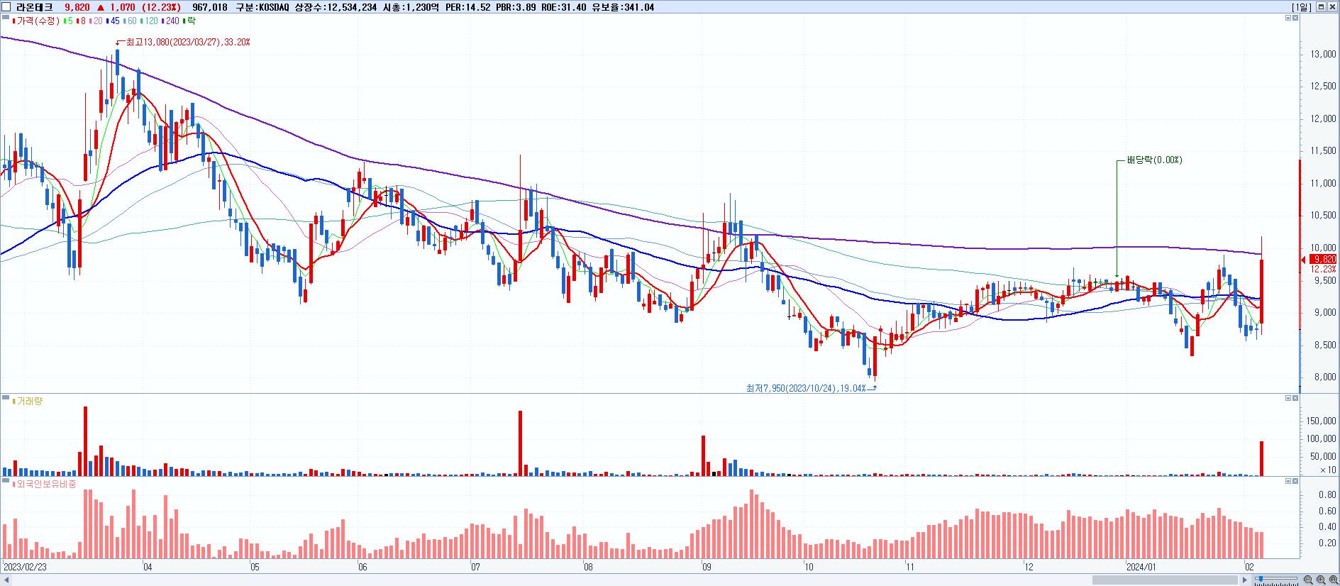- 라온테크 (9,820원 ▲ 12.23% , 시총: 1,231억, 거래량: 988,754, 거래대금:97억)