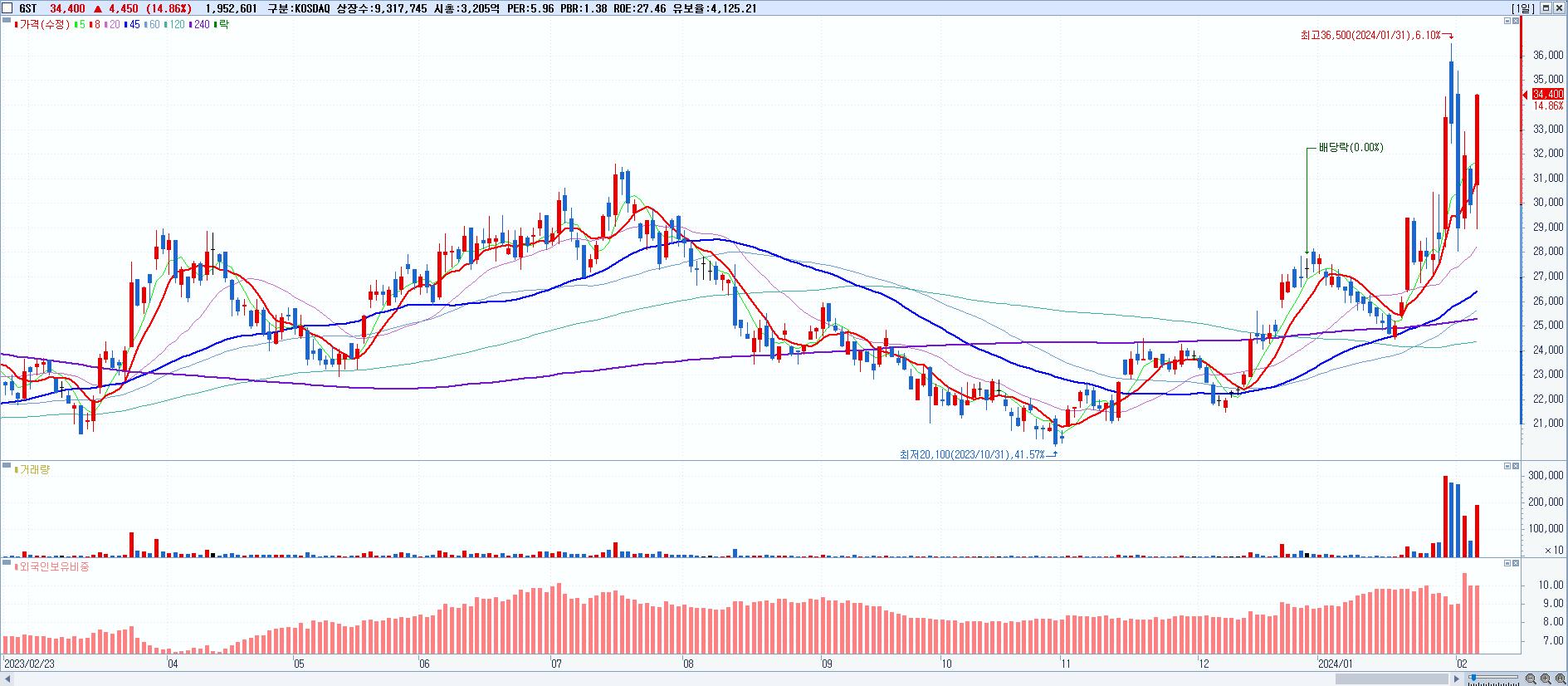 - GST (34,400원 ▲ 14.86% , 시총: 3,205억, 거래량: 1,966,847, 거래대금:643억)