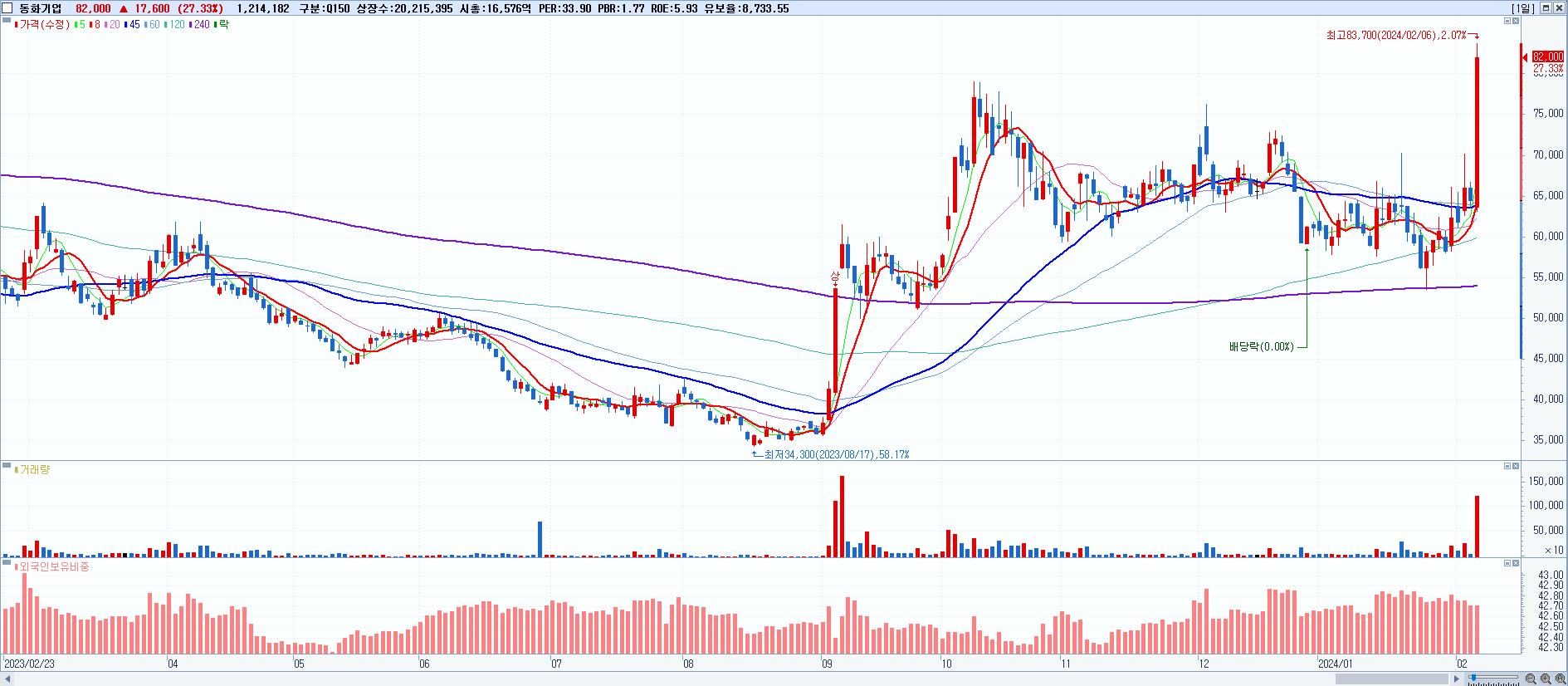 - 동화기업 (82,000원 ▲ 27.33% , 시총: 16,577억, 거래량: 1,219,082, 거래대금:962억)