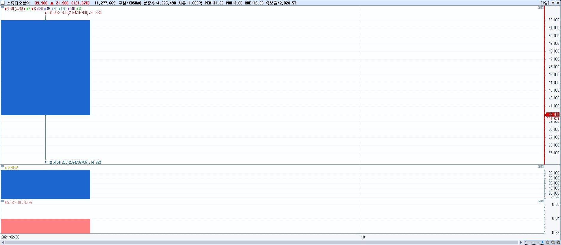 - 스튜디오삼익 (39,900원 ▲ 121.67% , 시총: 1,686억, 거래량: 11,424,298, 거래대금:4,945억)