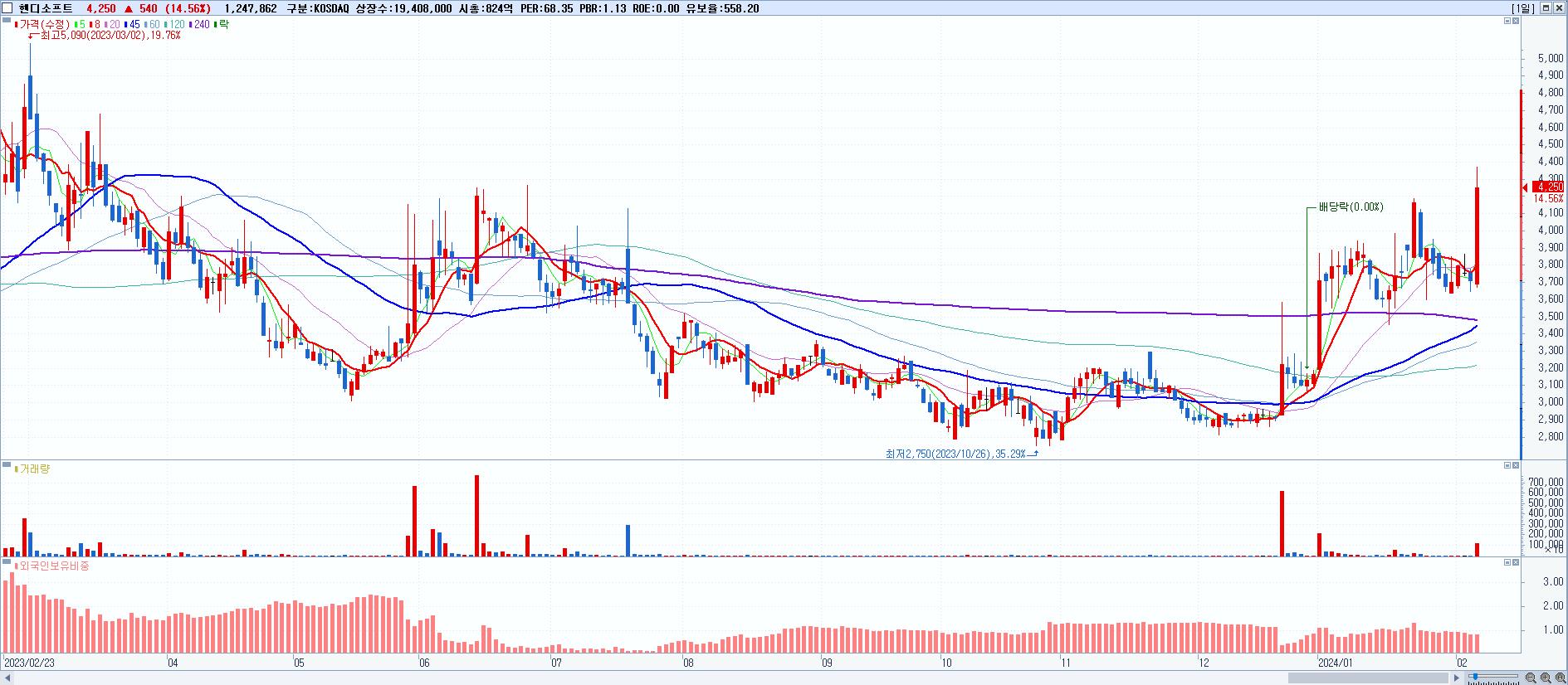 - 핸디소프트 (4,250원 ▲ 14.56% , 시총: 825억, 거래량: 1,264,106, 거래대금:53억)