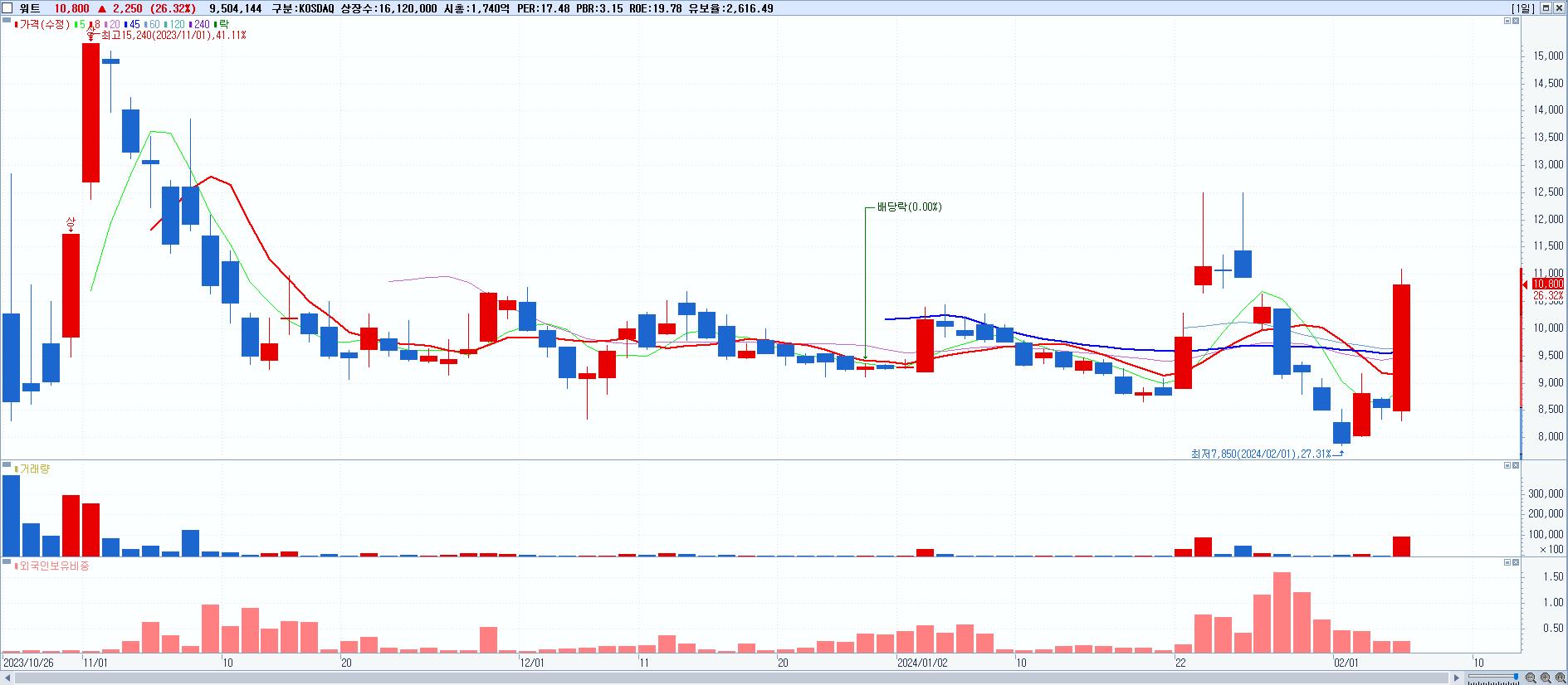 - 워트 (10,800원 ▲ 26.32% , 시총: 1,741억, 거래량: 9,604,415, 거래대금:1,009억)