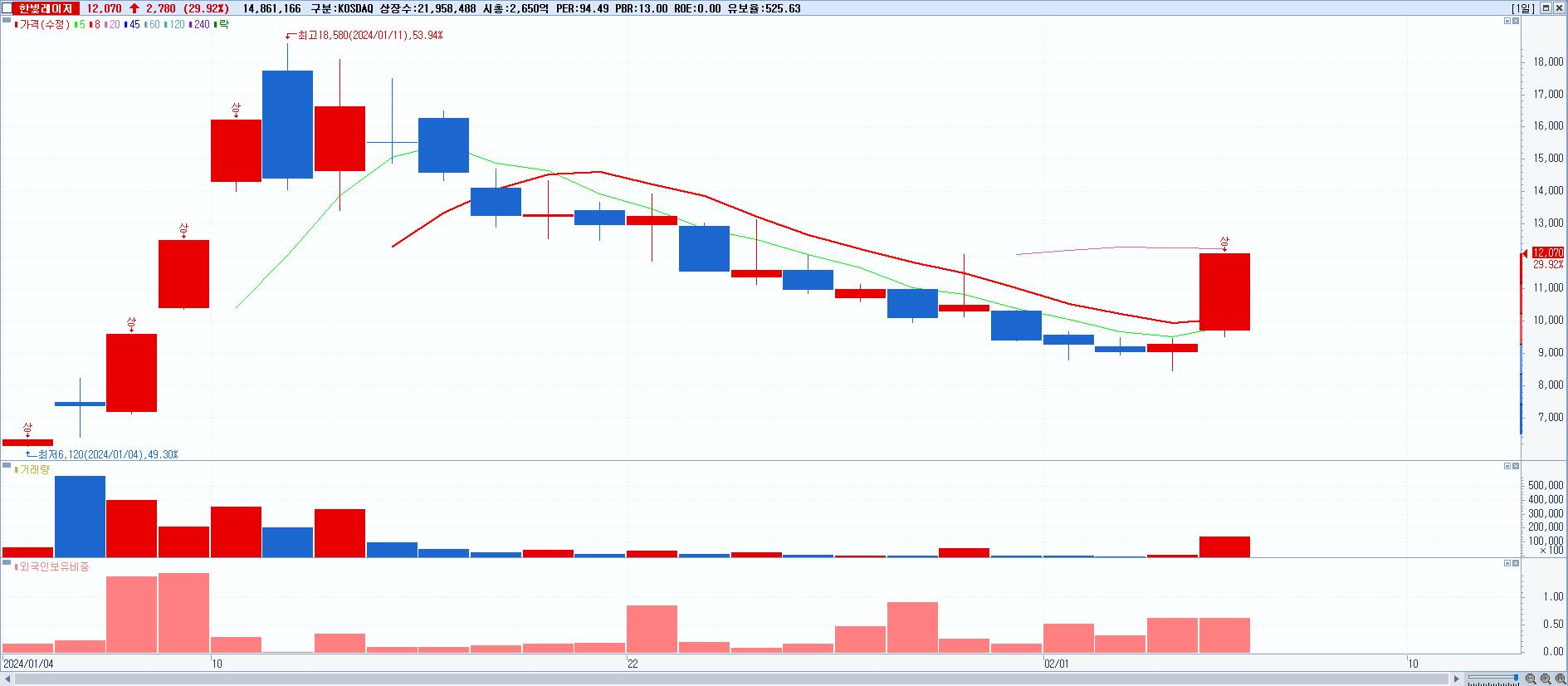 - 한빛레이저 (12,070원 ▲ 29.92% , 시총: 2,650억, 거래량: 14,862,652, 거래대금:1,659억)