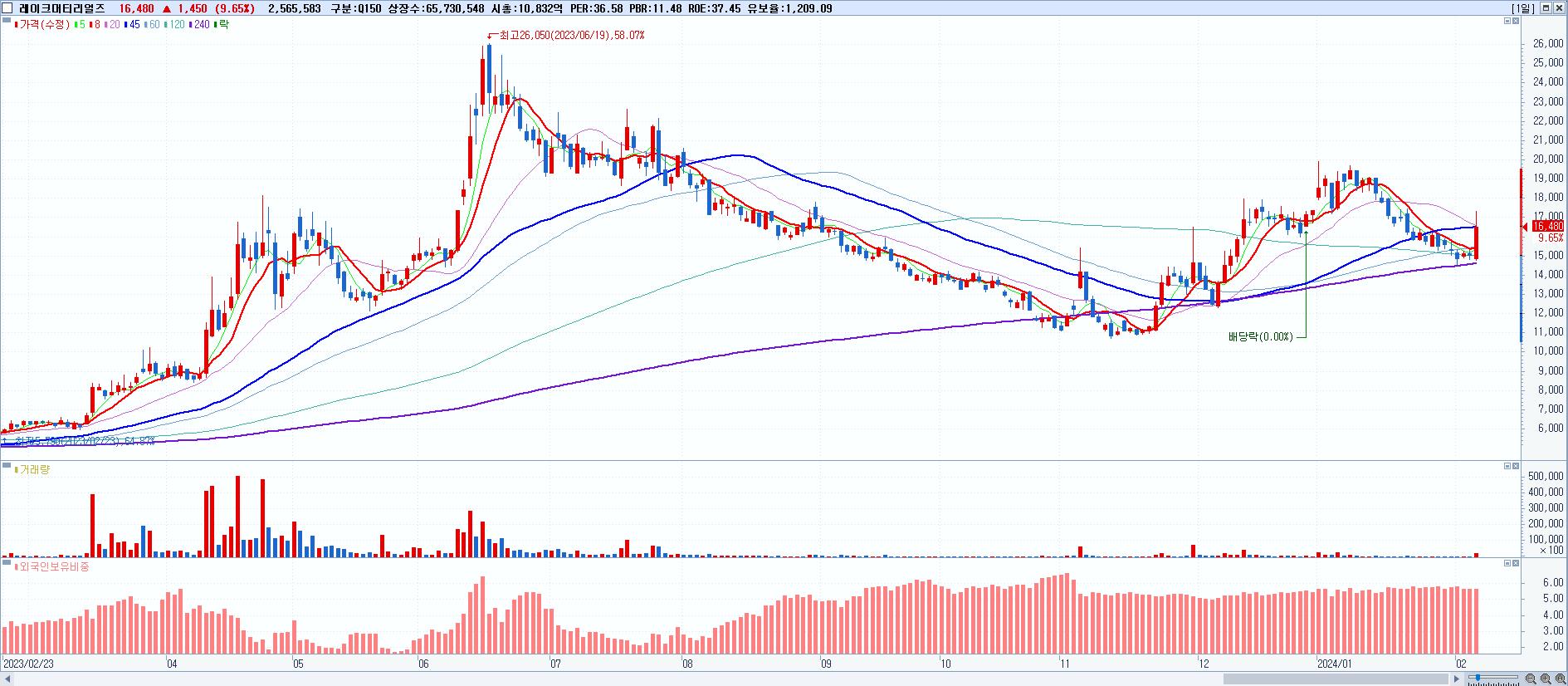 - 레이크머티리얼즈 (16,480원 ▲ 9.65% , 시총: 10,832억, 거래량: 2,568,778, 거래대금:422억)