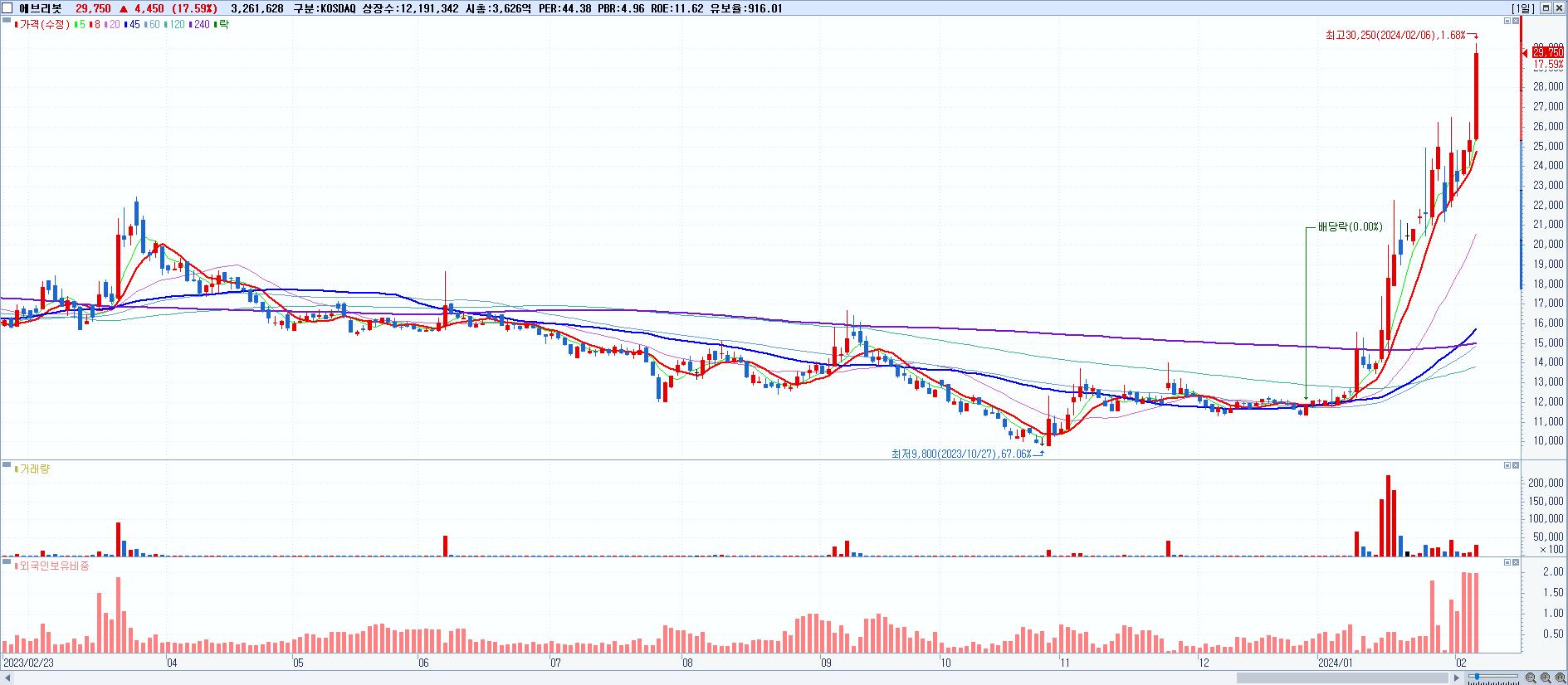 - 에브리봇 (29,750원 ▲ 17.59% , 시총: 3,627억, 거래량: 3,365,905, 거래대금:958억)