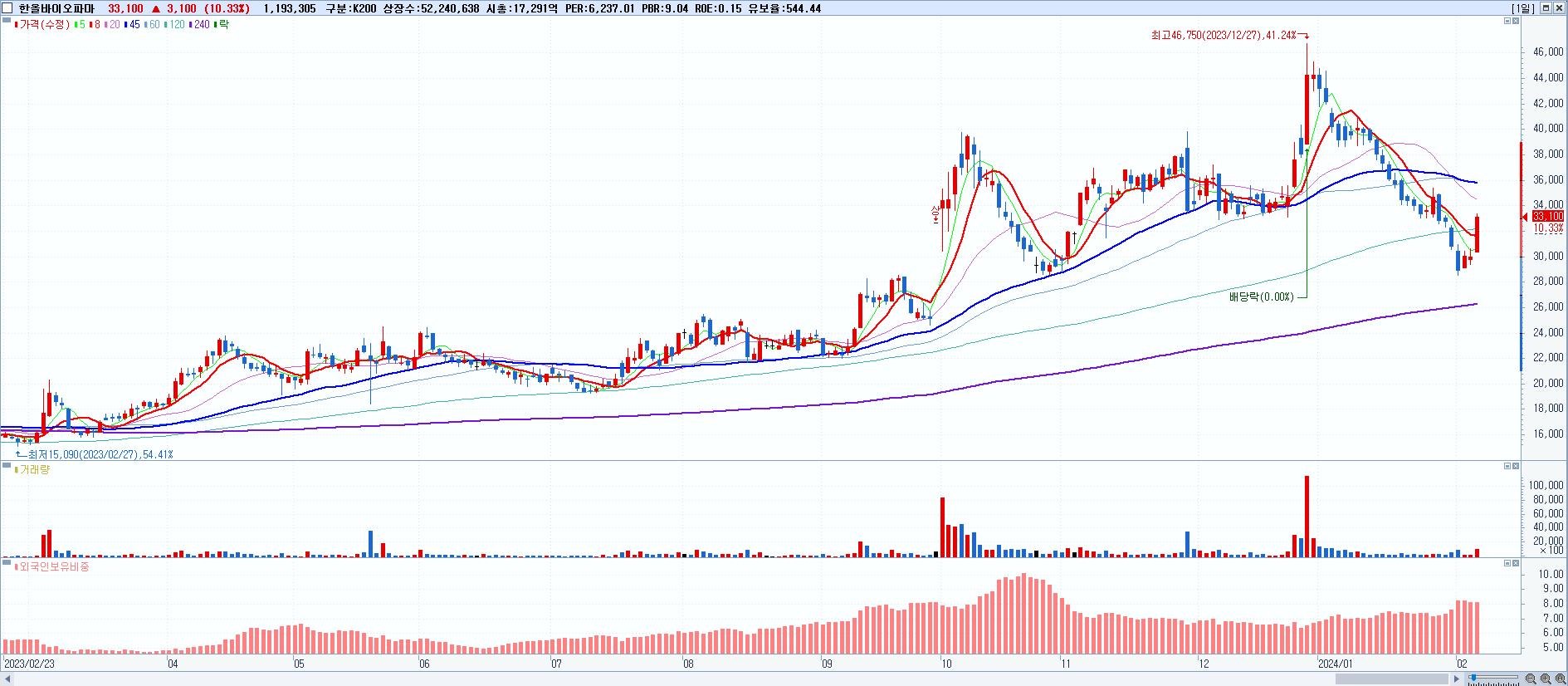- 한올바이오파마 (33,100원 ▲ 10.33% , 시총: 17,292억, 거래량: 1,197,821, 거래대금:387억)