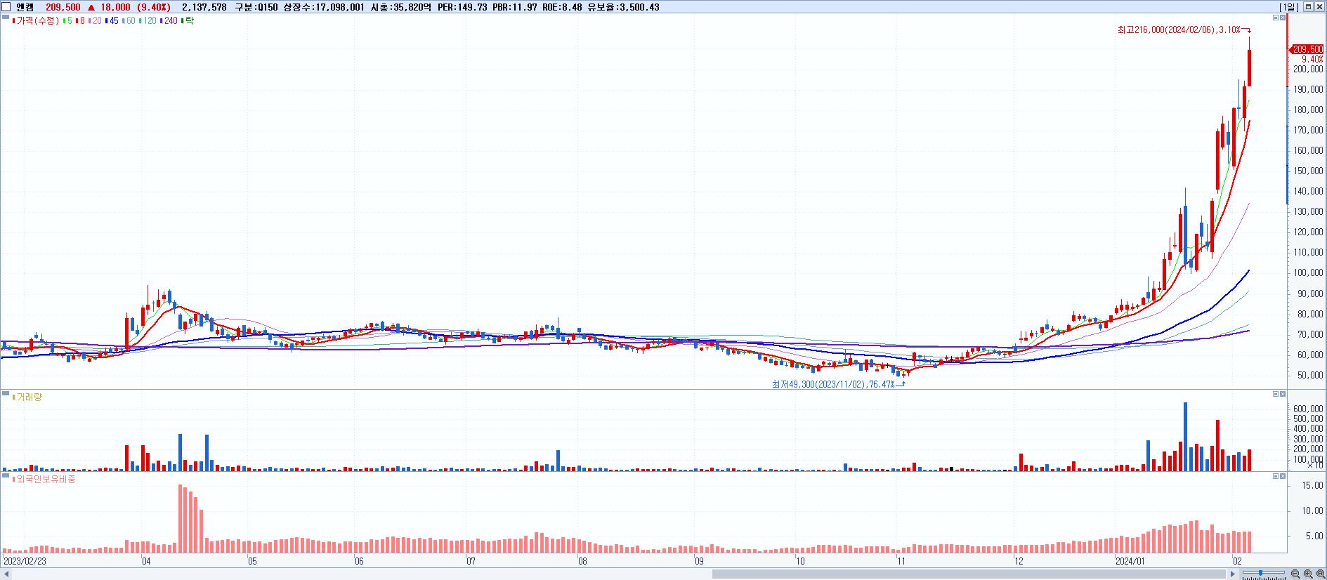 30.엔켐 209,500원 ▲ 9.4% (KOSDAQ, 348370)