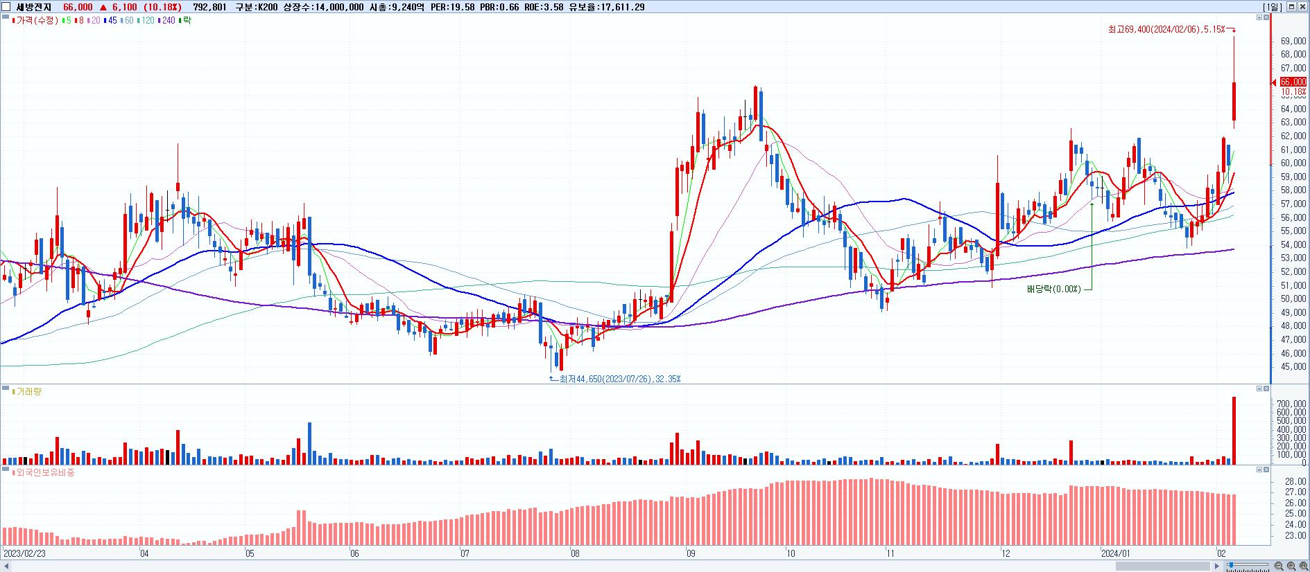 - 세방전지 (66,000원 ▲ 10.18% , 시총: 9,240억, 거래량: 793,344, 거래대금:529억)