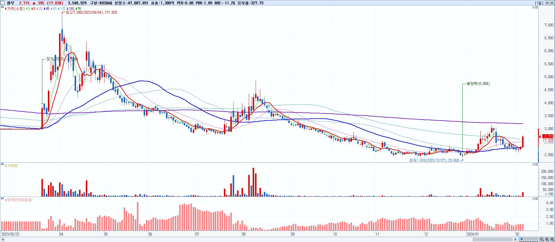 - 광무 (2,715원 ▲ 17.03% , 시총: 1,300억, 거래량: 3,557,876, 거래대금:93억)