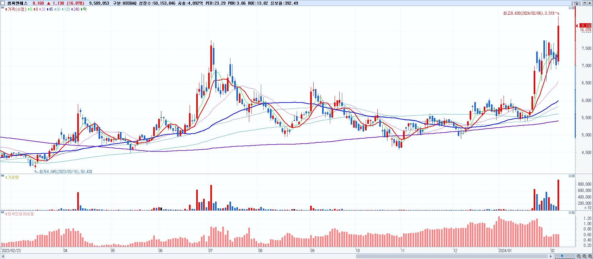- 샘씨엔에스 (8,160원 ▲ 16.07% , 시총: 4,093억, 거래량: 10,081,977, 거래대금:804억)