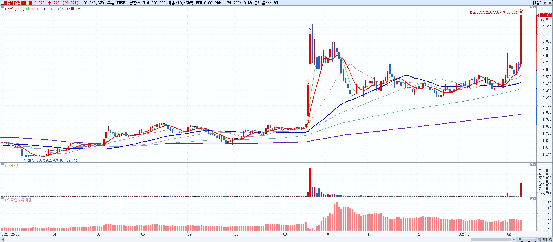 3.롯데손해보험 3,370원 ▲ 29.87% (KOSPI, 000400)