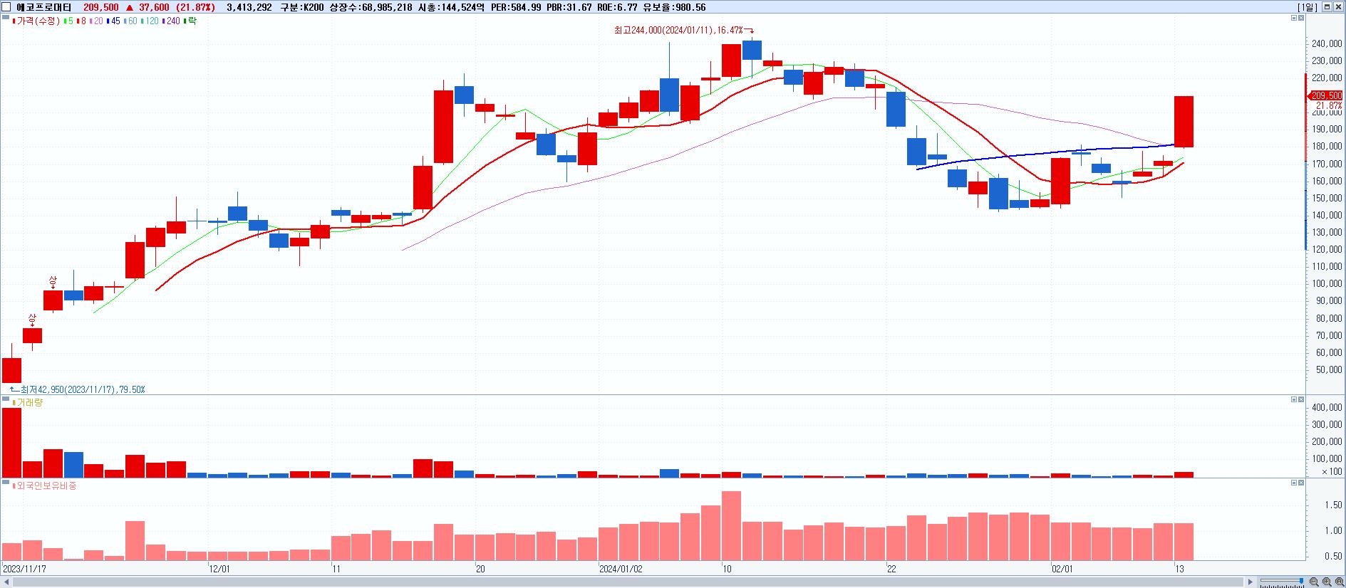 - 에코프로머티 (209,500원 ▲ 21.87% , 시총: 144,524억, 거래량: 3,445,494, 거래대금:6,738억)