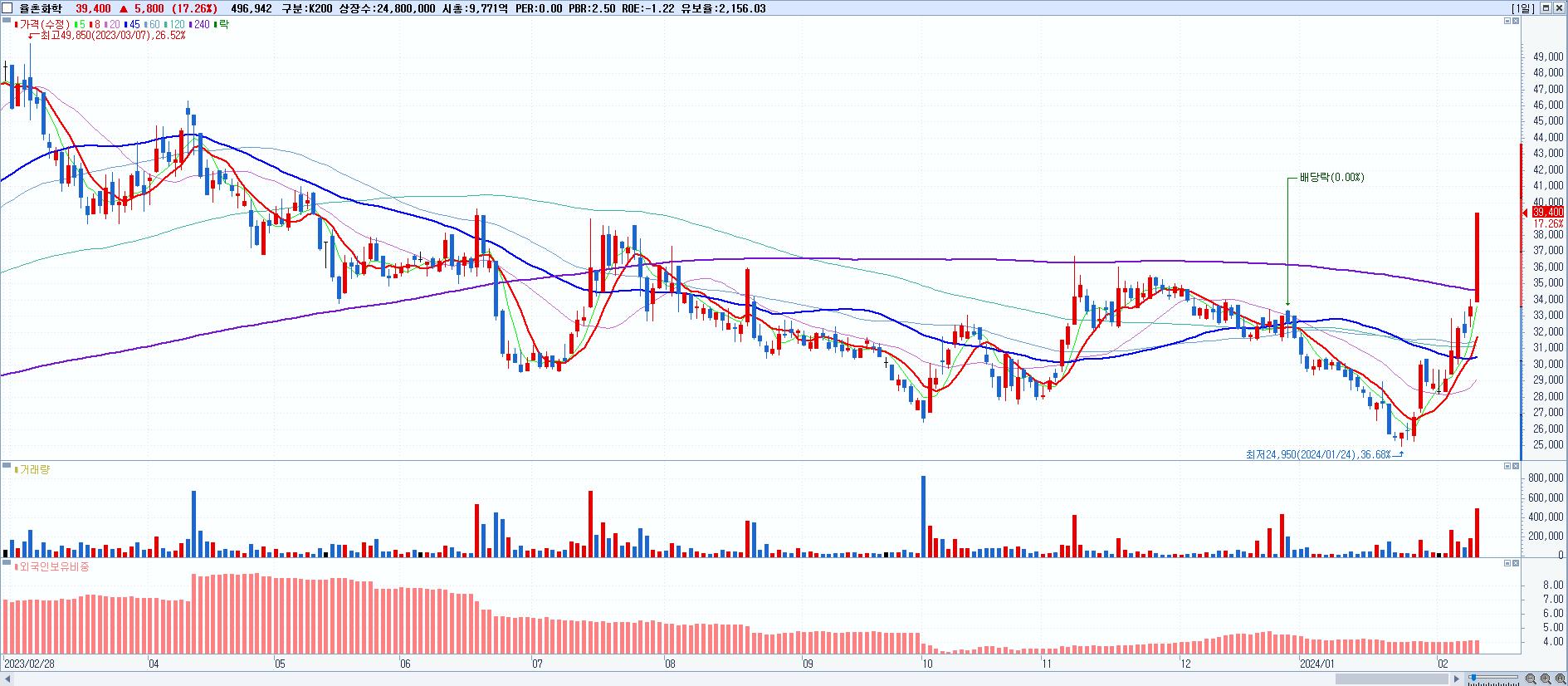 - 율촌화학 (39,400원 ▲ 17.26% , 시총: 9,771억, 거래량: 500,315, 거래대금:185억)