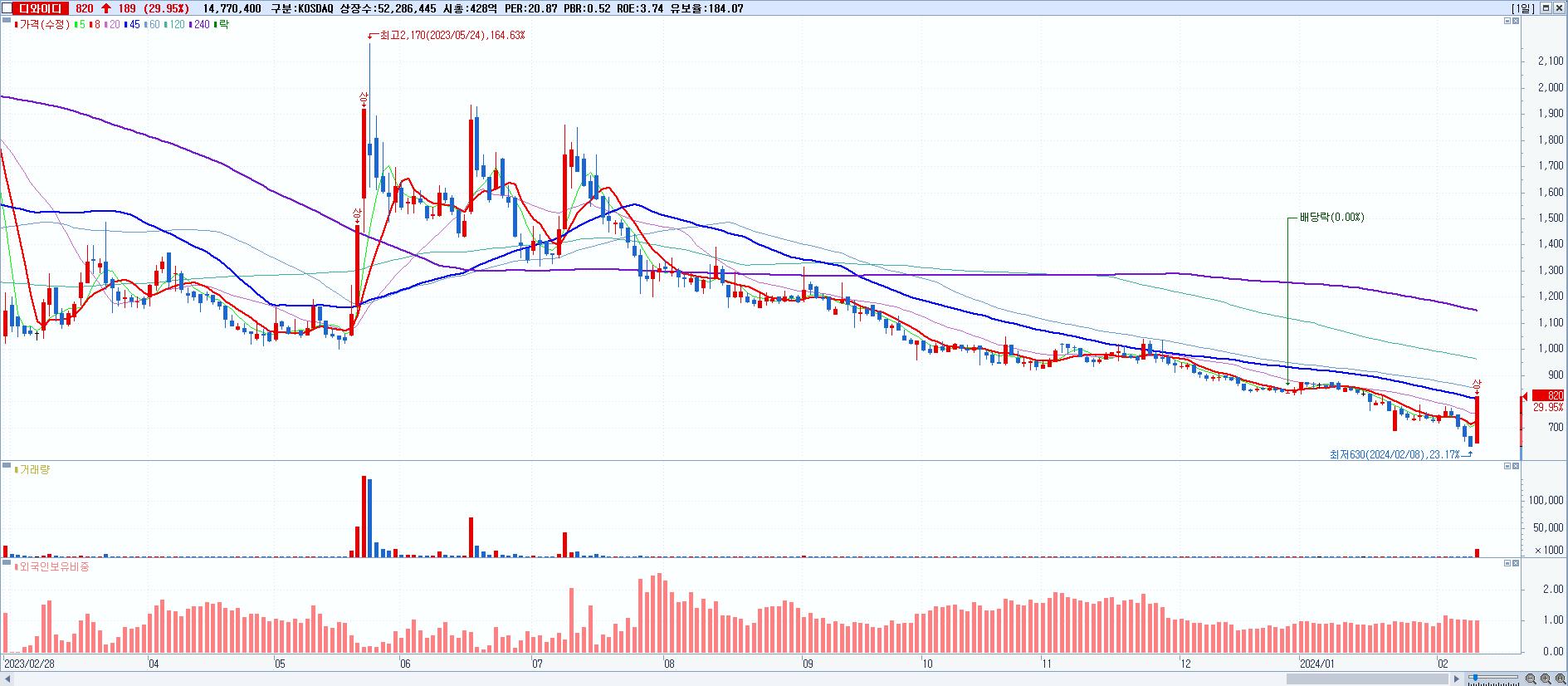 1.디와이디 820원 ▲ 29.95% (KOSDAQ, 219550)