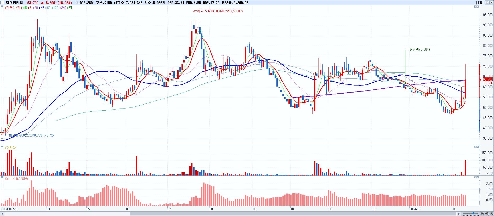 - 탑머티리얼 (63,700원 ▲ 16.03% , 시총: 5,086억, 거래량: 1,039,798, 거래대금:682억)