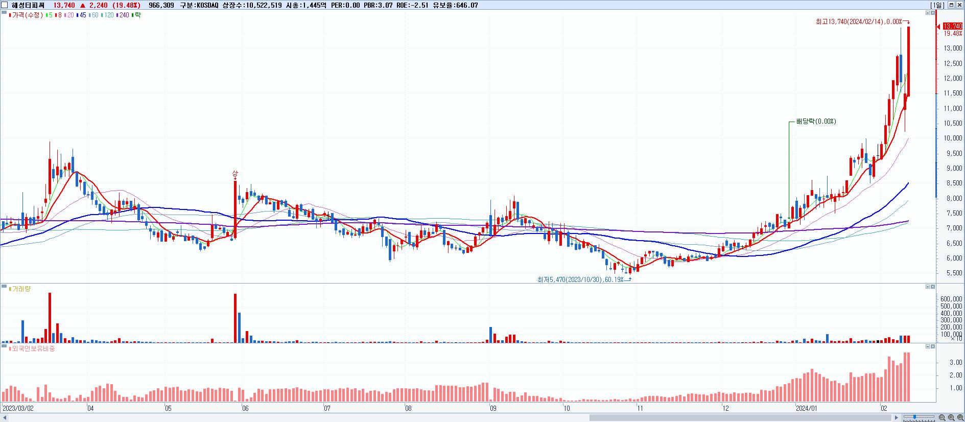 - 해성티피씨 (13,740원 ▲ 19.48% , 시총: 1,446억, 거래량: 974,386, 거래대금:121억)