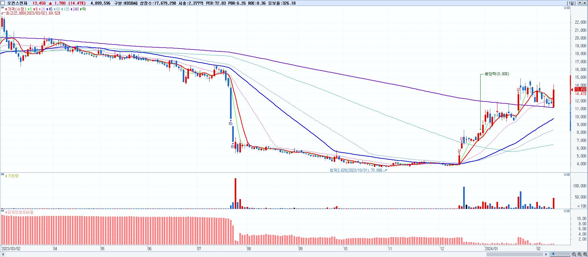- 오킨스전자 (13,450원 ▲ 14.47% , 시총: 2,378억, 거래량: 4,905,025, 거래대금:647억)