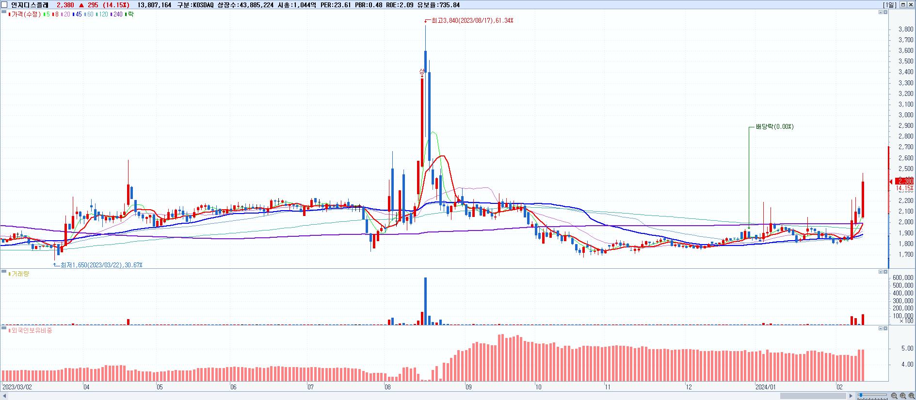 - 인지디스플레 (2,380원 ▲ 14.15% , 시총: 1,044억, 거래량: 13,875,523, 거래대금:325억)