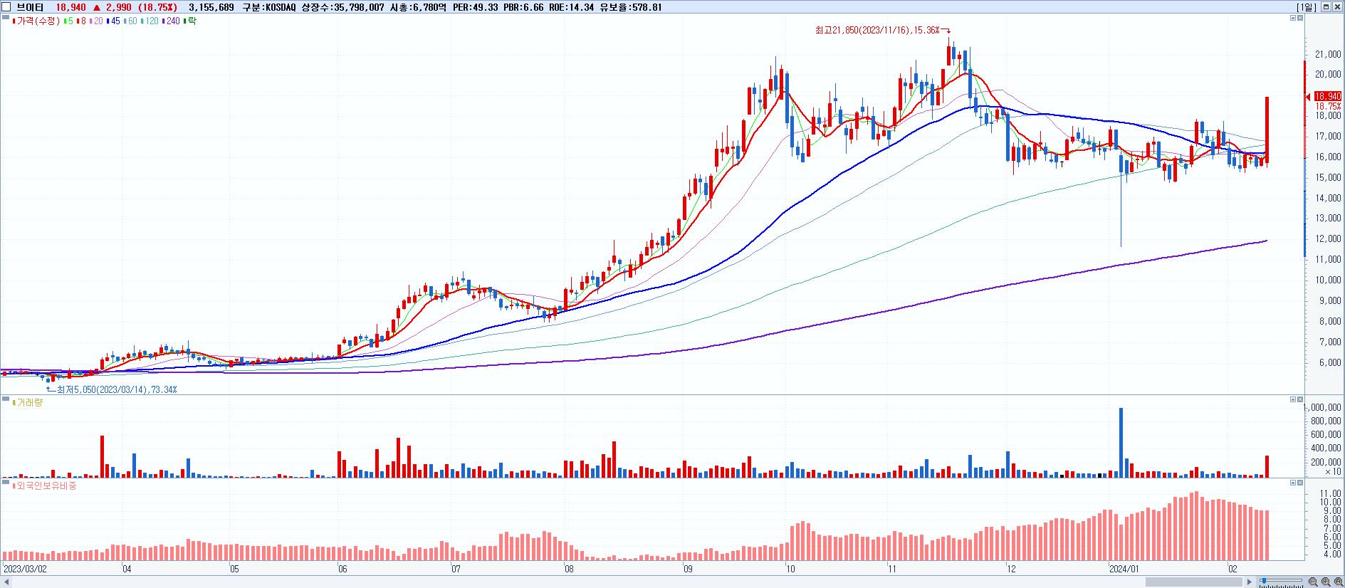 - 브이티 (18,940원 ▲ 18.75% , 시총: 6,780억, 거래량: 3,157,559, 거래대금:567억)